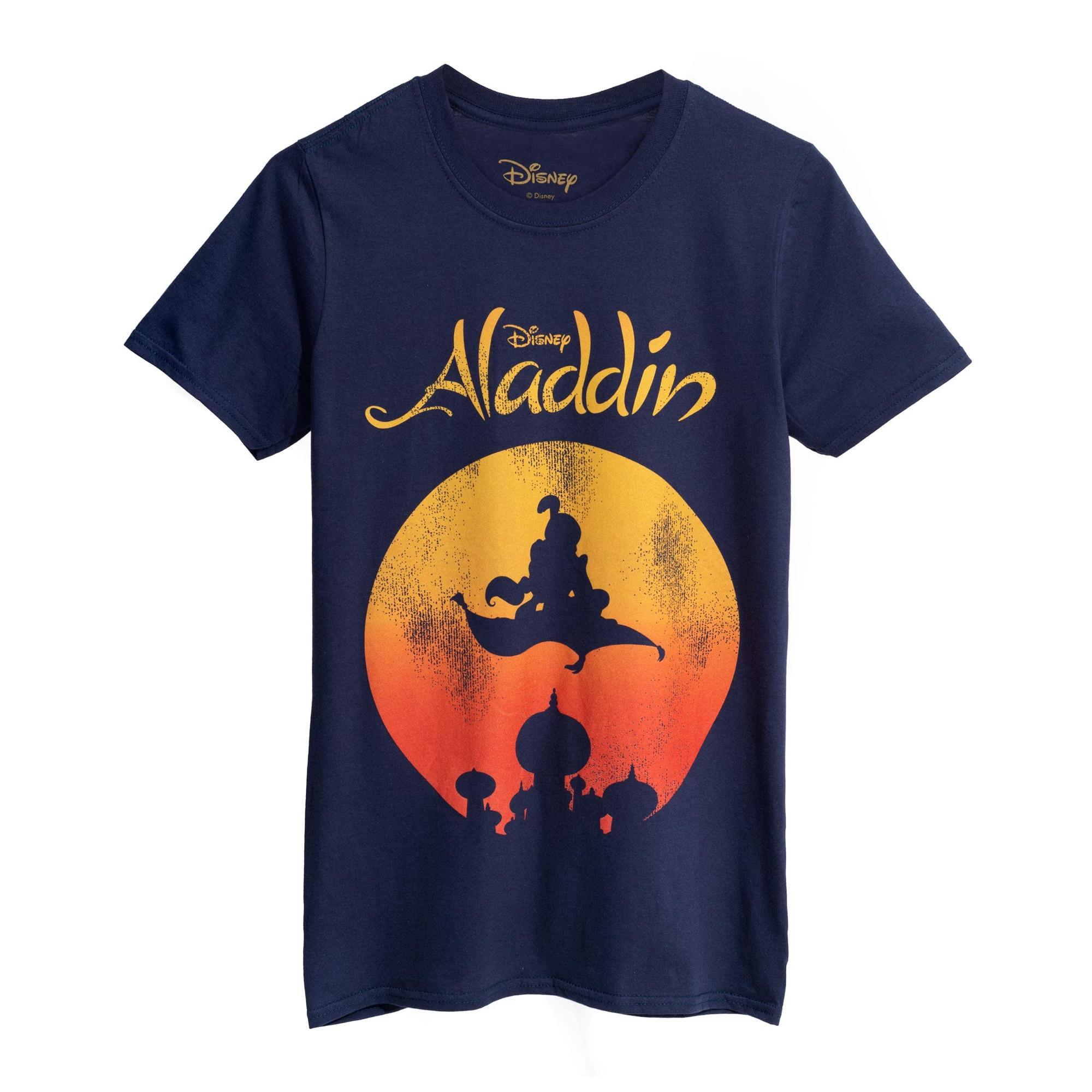 Dieses kurzärmlige T-Shirt zeigt einen lebendigen Grafikdruck von Aladdin auf seinem fliegenden Teppich vor einem Sonnenuntergang. Das klassische Rundhalsdesign sorgt für eine bequeme Passform für den Alltag.