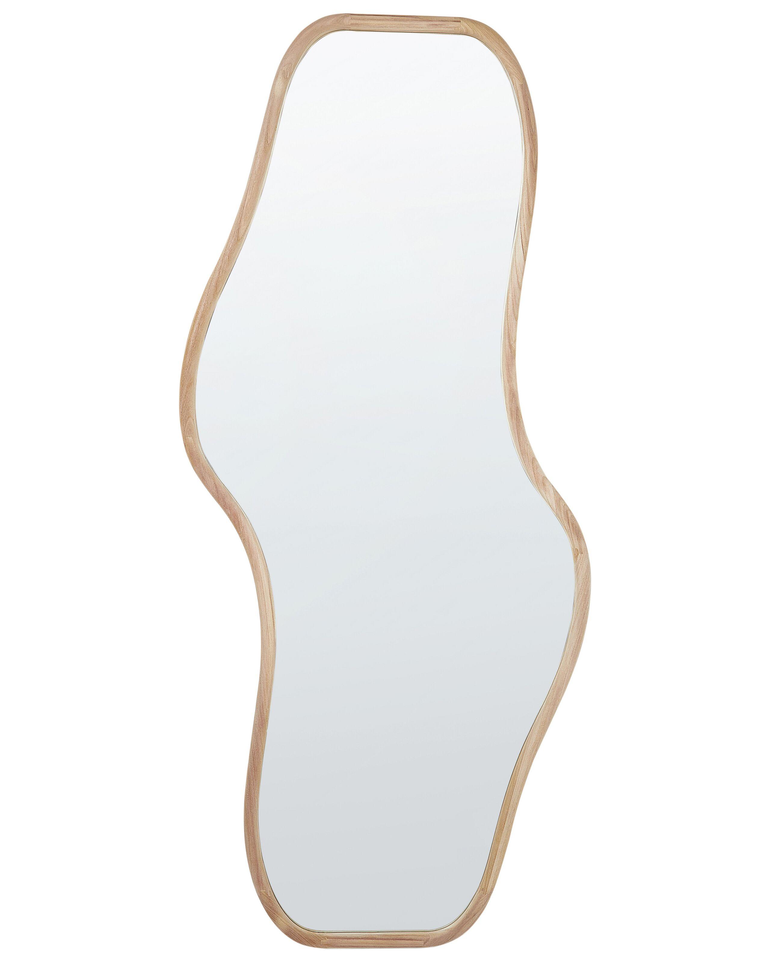 Moderner Hängespiegel mit asymmetrischem Holzrahmen. Dieser unförmige Spiegel und sein heller Holzrahmen verschönern sicherlich jede moderne Wohnwand. Ein wahrheitsgetreues Abbild wird durch die glatte, ebene Spiegelfläche erzielt. Man kann den Spiegel nicht nur im Flur oder der Garderobe platzieren, sondern auch in kleineren Räumen aufhängen, um diese optisch zu vergrössern. Durch die integrierten Aufhängehaken wird die Montage zum Kinderspiel.