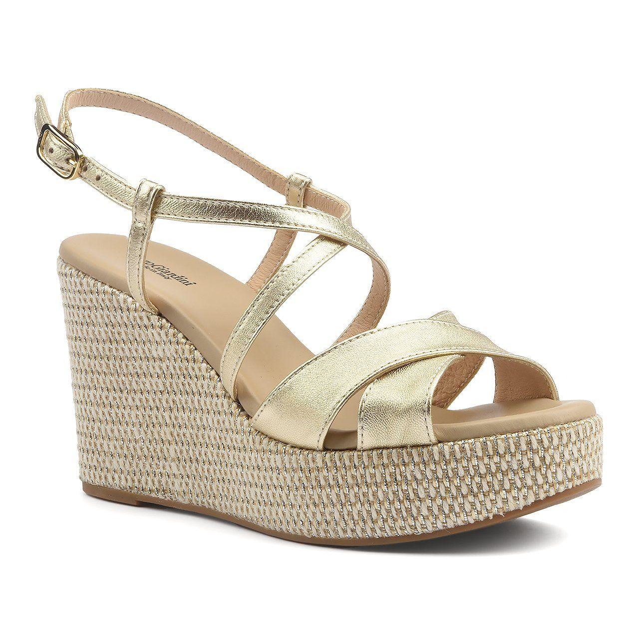 Die Malfa Keilsandalen bieten einen eleganten und kühnen Stil für Abend- und Sommerausflüge. Entworfen aus Metallleder, verfügen diese Sandalen über ein metallisches Leder oben und oben, während das Futter und die Innensohle aus Leder sind. Die Laufsohle ist aus Gummi. Der Absatz misst 90 mm und bietet optimale Stabilität und Komfort. Die Details der metallischen Ledersandale und die goldene Farbe tragen zu ihrem einzigartigen Stil bei.
