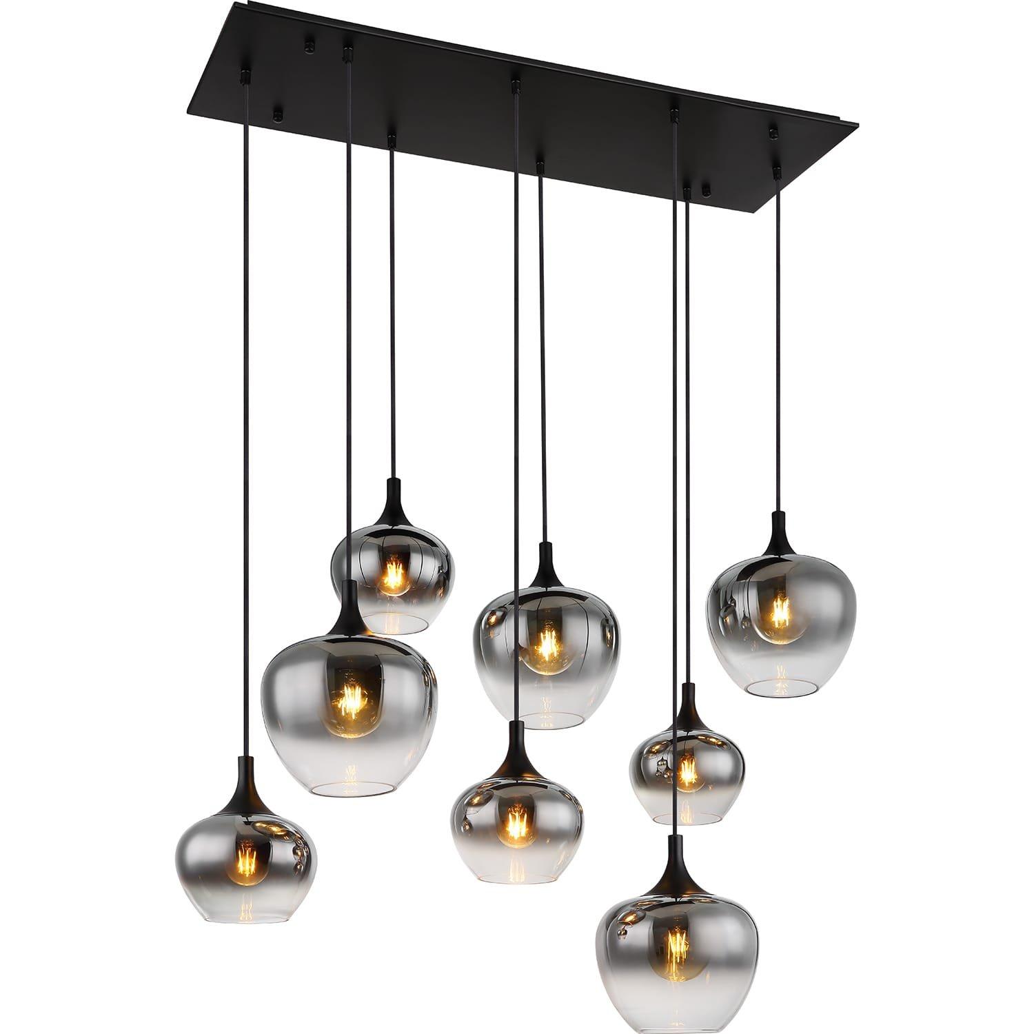 Diese wunderschöne Hängeleuchte begeistert durch ein tolles Design. Aus einer rechteckigen Deckenbefestigung (105 x 45 cm) ragen acht Kabel in unterschiedlichen Längen zu je einer E27 Fassung, an diesen sich jeweils formschöne rauchfarbene Glasschirme befinden. Die E27 Fassungen ermöglichen Ihnen bis zu einer maximalen Leistung von 40 Watt, selbst über Lichtfarbe und Helligkeit zu bestimmen. Aufgrund von Langlebigkeit und Stromersparnis empfehlen wir LED Leuchtmittel.