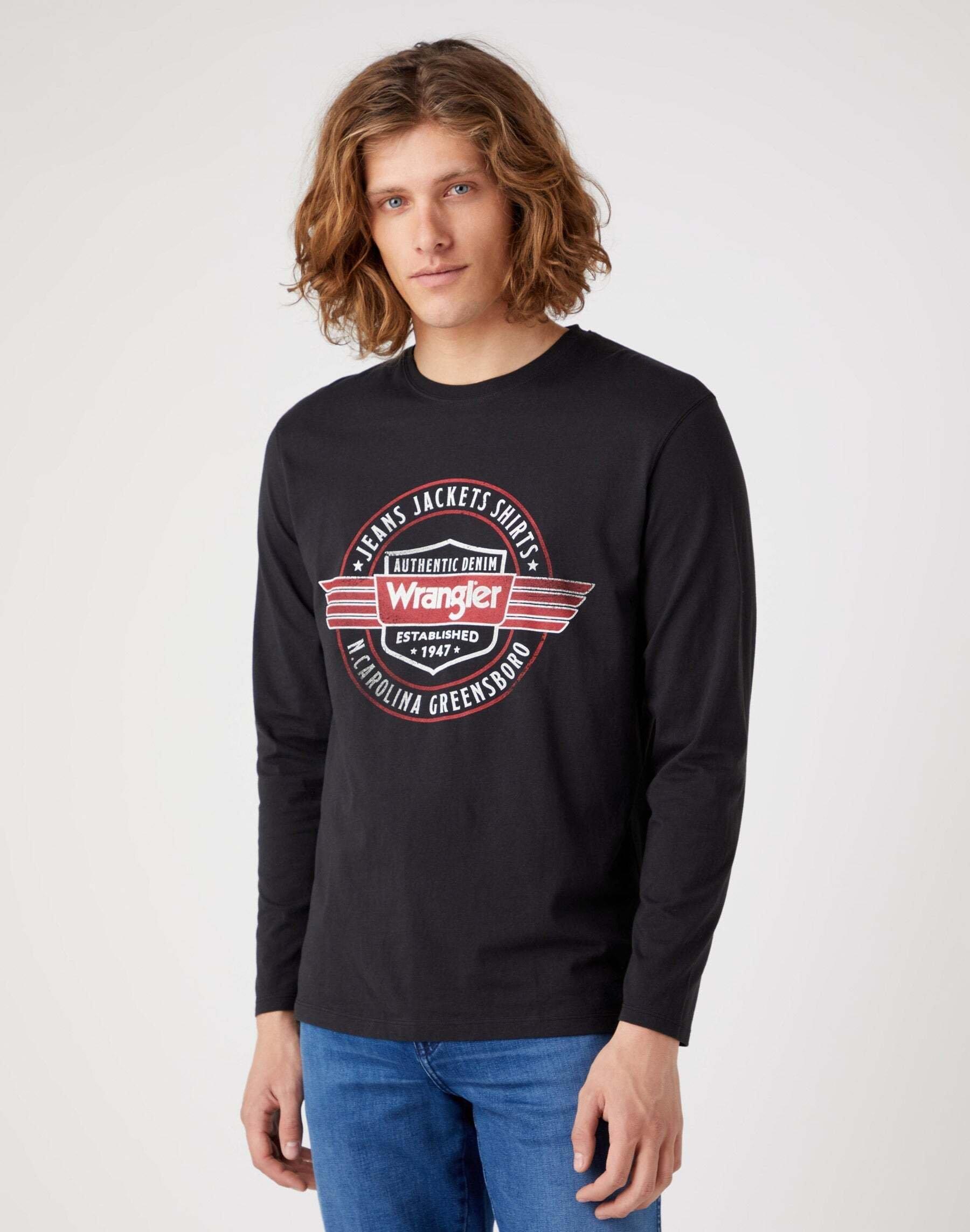 Dieses Americana Langarmshirt in regulärer Passform ist eine authentische Ergänzung für jede Garderobe. Beeinflusst von Vintage-Americana ist dieses langärmelige T-Shirt in verwaschenem Schwarz eine Hommage an das Erbe von Wrangler. Es ist mit einer Original-Grafik versehen und aus 100 % Baumwolle für ganztägigen Tragekomfort gefertigt.