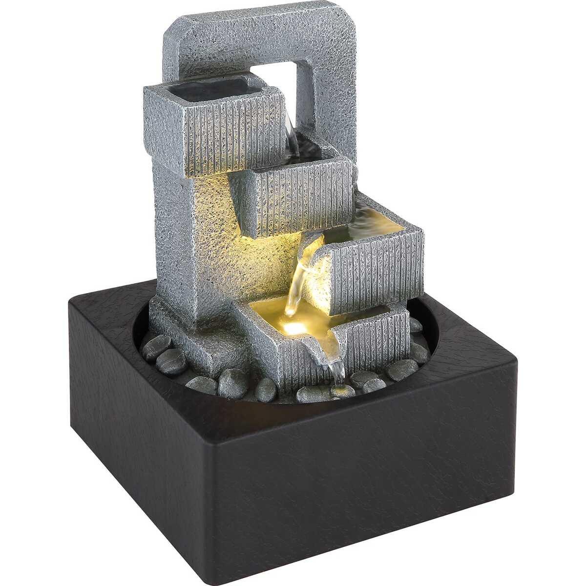 Diese dekorative Tischleuchte der Serie Fontana erschafft durch Ihr mystisches Design und den beruhigenden Wasser sprudeln eine tolle Atmosphäre in Ihren Räumen. Der Brunnen wird mittels integrierter Pumpe nach oben befördert und verläuft stufenförmig nach unten. Der Brunnen beinhaltet ein angenehmes warmweisses LED-Leuchtmittel (3000 Kelvin) mit zusätzlichem 1,5m langem Kabel.Brunnen Kunststoff anthrazit, Adapter inkl., 3W 12V Pumpe, LxBxH: 180x180x240mm, Kabellänge 1500mm, inkl. LED 0.13W 3V, 3000K, Steckertyp: Flat.