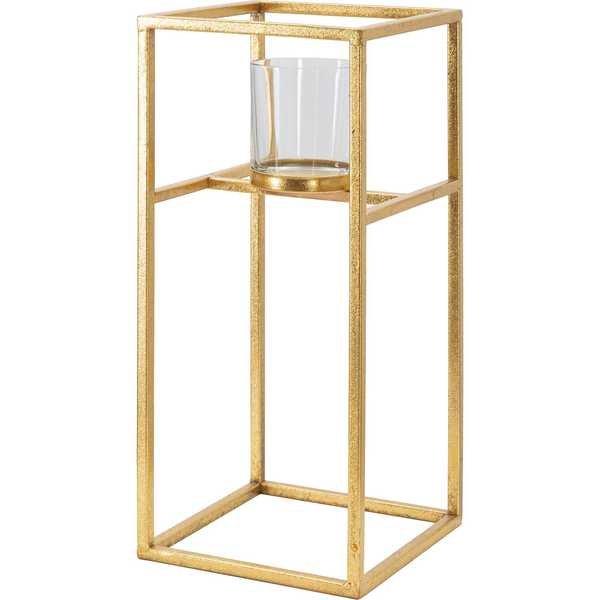 Kerzenhalter aus goldenem Metall mit geometrisch quadratischer und linearer Struktur, mit 1 Glasbehälter.