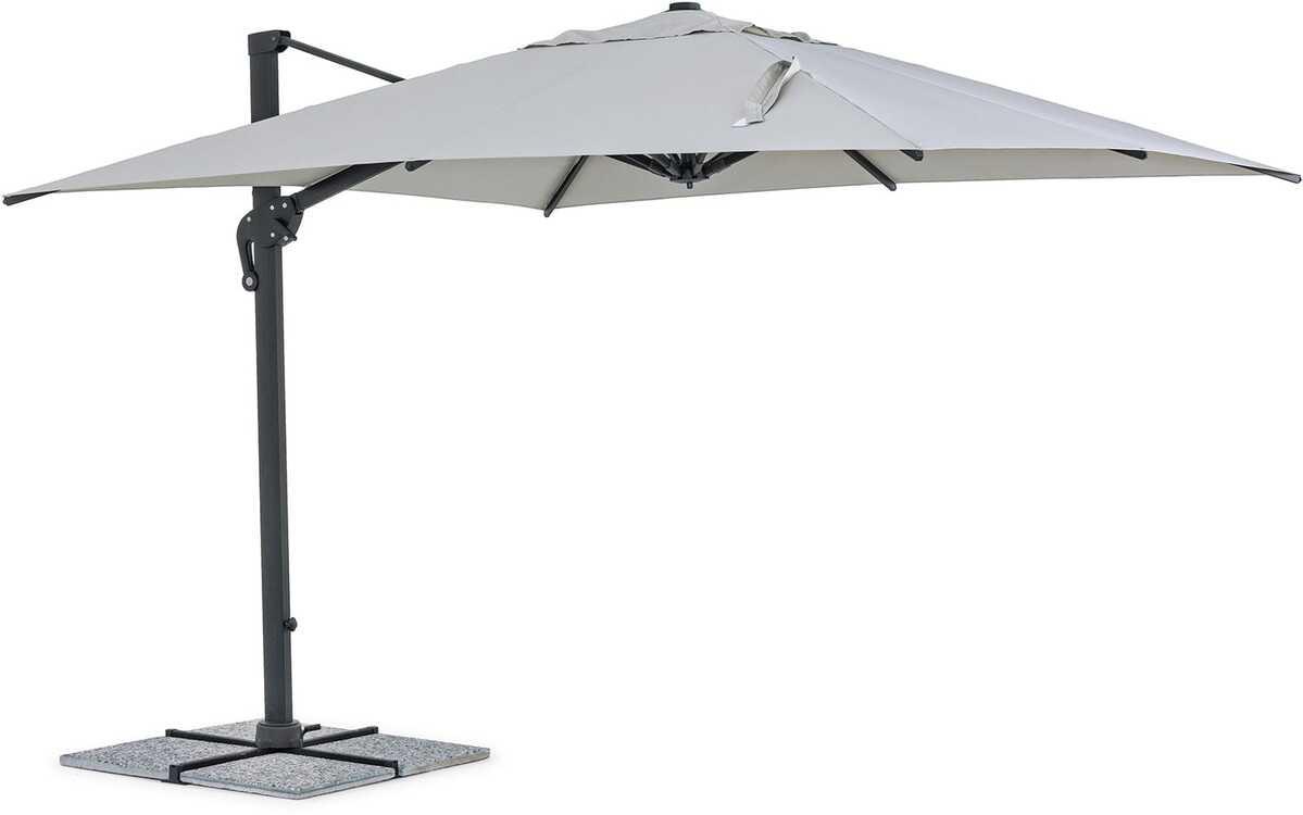 Sonnenschirm/Ampelschirm mit Gestell aus Aluminium mit Pulverbeschichtung (Polyester). Mast 93x57mm. 8 Streben 28x18mm. Tuch hellgrau aus Polyester 250g/m2 mit Beschichtung aus PA (Polyamid). Stahl-Standkreuz. Mast schwenkbar um 360° mit Pedal. Vertikale Neigung mit Griff mit 4 Positionen verstellbar. Mit Schutzhülle. Gewichte für Schirmständer nicht inbegriffen (benötigt werden 4 Platten, 50x50).Ausgelegt auf Led-Leuchte Artikelnummer 795364 und Lautsprecher Artikelnummer 795365.