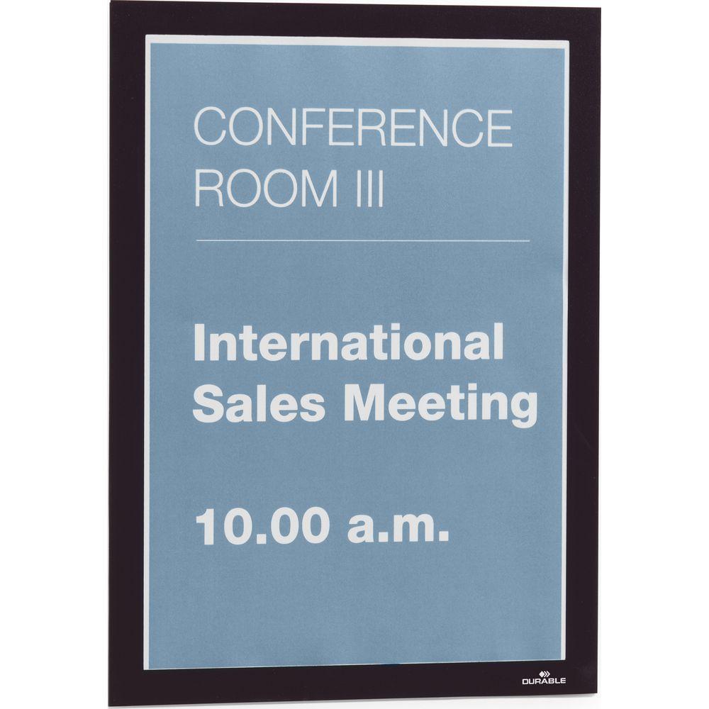 DURAFRAME - Info-RahmenDer selbstklebende Info-Rahmen für Informationen im Format A4Informationen hochwertig und professionell präsentierenSchnelles Einlegen und Auswechseln von Dokumenten durch aufklappbaren MagnetrahmenEinfaches Anbringen auf glatten, tragfähigen Oberflächen ohne Hilfsmittel kann z. B. von Glas wieder entfernt werdenAnwendungsbereiche: Für Dokumente in A4 wie z. B. Raumkennzeichnungen, Orientierungsinformationen und AngeboteDoppelseitige Lesbarkeit an Glasflächen durch 2 EinlagenIdentische Optik des Rahmens von beiden SeitenAussenmasse: 236 x 323 mm