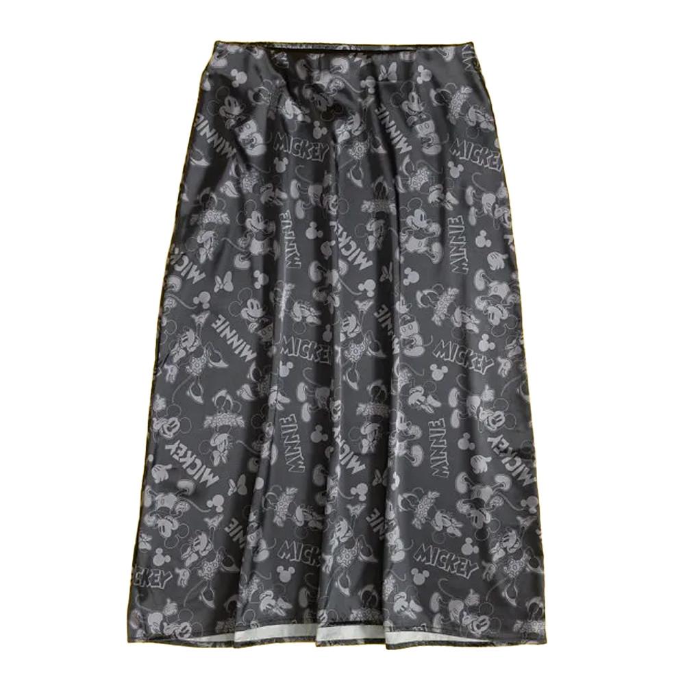 Dieser Midirock ist aus Satin gefertigt und bietet ein glattes und glänzendes Finish. Das Design zeigt einen Allover-Druck von Mickey Mouse und Minnie Mouse sowie deren Namen, was dem Kleidungsstück eine verspielte Note verleiht. Die Länge und das Material des Rocks machen ihn zu einem vielseitigen Stück für verschiedene Anlässe.
