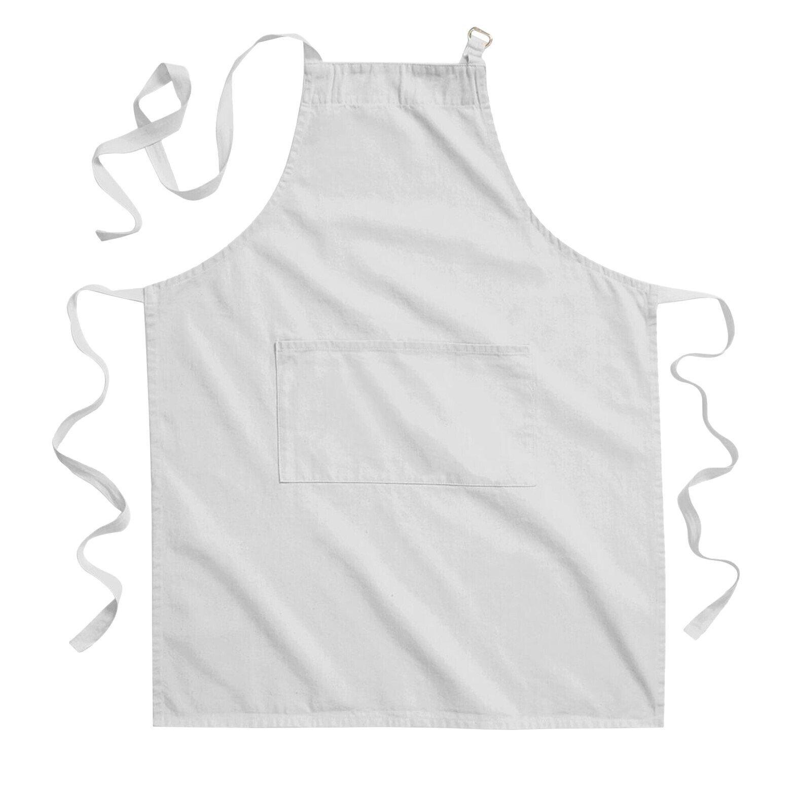 Schürze mit Latz. FairTrade-zertifiziert. Tiefe Vordertasche. Baumwoll-Nackenband mit Fischgrätmuster und verstellbarer Gleitschnalle. Taillenbindegürtel 100 cm. Länge der Schürze: 93 cm Breite der Schürze: 72 cm. 100% Baumwolle.