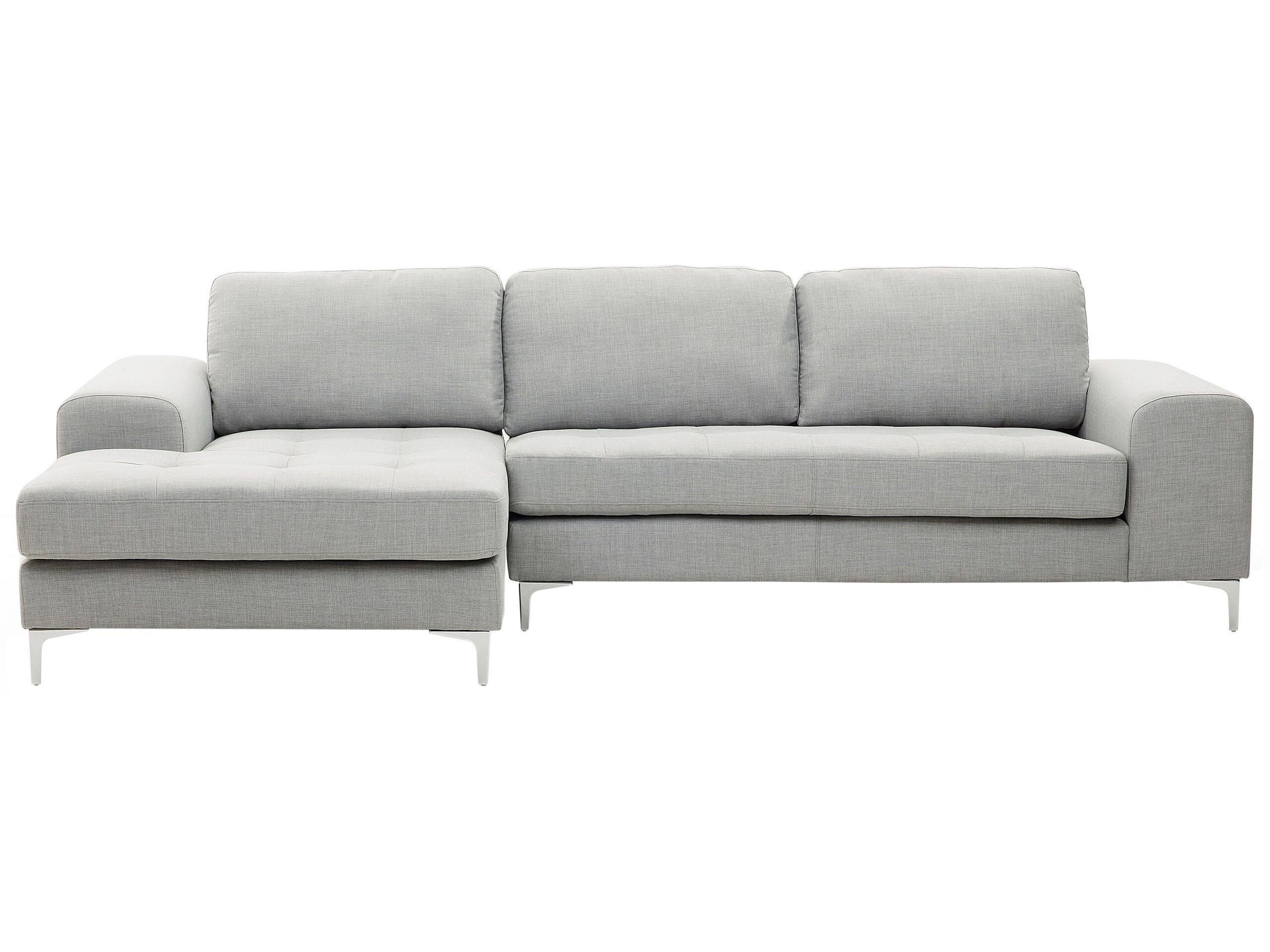 Gemütliches, freistehendes Ecksofa mit Chaiselongue, losen Rückenkissen und Metallfüssen. Dieses bequeme Polstersofa ist genau das, was Sie für Ihr Wohnzimmer benötigen. Es besteht aus einem stabilen Holzrahmen, der mit dickem Schaumstoff ausgepolstert und mit einem strapazierfähigen, weichen Stoffbezug versehen ist. Die qualitativen Materialien sorgen für Haltbarkeit und Langlebigkeit des Modells. Als Polsterecke bietet es eine grosse Sitzfläche, auf der man es sich gemütlich machen kann. Die gut verarbeiteten Rückenkissen verstärken den Wohlfühlcharakter dieses Möbelstücks. Dies unterstützen auch die breiten Armlehnen. Dabei sind die zusätzlichen Kissen mit einem abnehmbaren Bezug versehen, der eine einfache Reinigung ermöglicht.