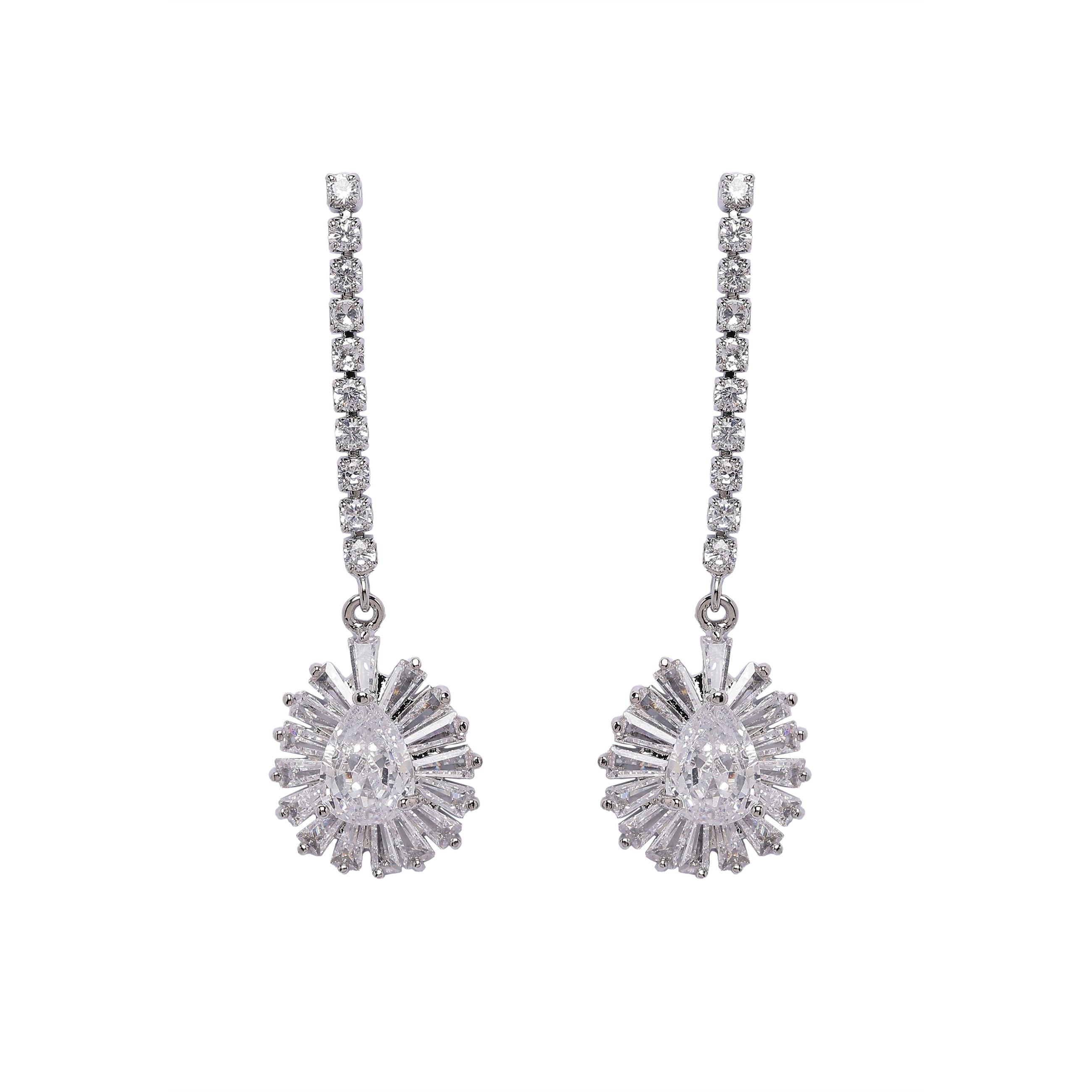 Diese Ohrringe sind ein atemberaubendes Funkeln! Ein schillerndes Feuerwerk an Steinen gipfelt in einem wunderschönen, birnenförmigen Anhänger und verleiht jedem Outfit einen bezaubernden und eleganten Touch. Sie sind perfekt, um jedem Outfit einen Hauch von Glamour und Raffinesse zu verleihen. Größe: 1,1 cm x 4,5 cm | Beschichtung: Rhodiumplattiert | Verschluss: Stecker und Rückseite