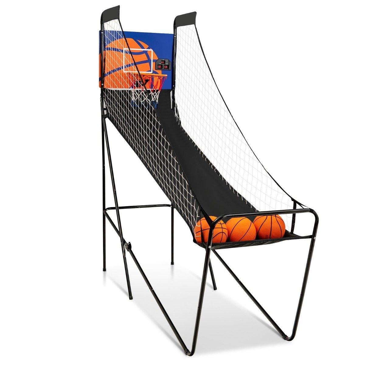 Sind Sie bereit, Ihre Spieleabende und Partys mit einer aufregenden neuen Herausforderung zu bereichern? Unsere hochmoderne Basketballmaschine ist darauf ausgelegt, Ihren Zusammenkünften endlosen Spaß und Wettbewerb zu bieten. Ausgestattet mit drei Basketbällen und einer praktischen Pumpe eignet sich dieses Spiel im Arcade-Stil perfekt für Freundschaftsspiele mit Familie und Freunden. Die Konstruktion aus robustem Stahl sorgt für ein sicheres und zuverlässiges Spielerlebnis. Die Rampe aus robustem Oxford-Gewebe ermöglicht ein schnelles Zurückrollen der Bälle und sorgt so für ein kontinuierliches Spiel. Bei Nichtgebrauch kann die Maschine zur kompakten Aufbewahrung einfach zusammengeklappt werden, was sie zu einer idealen Ergänzung für jedes Zuhause macht.