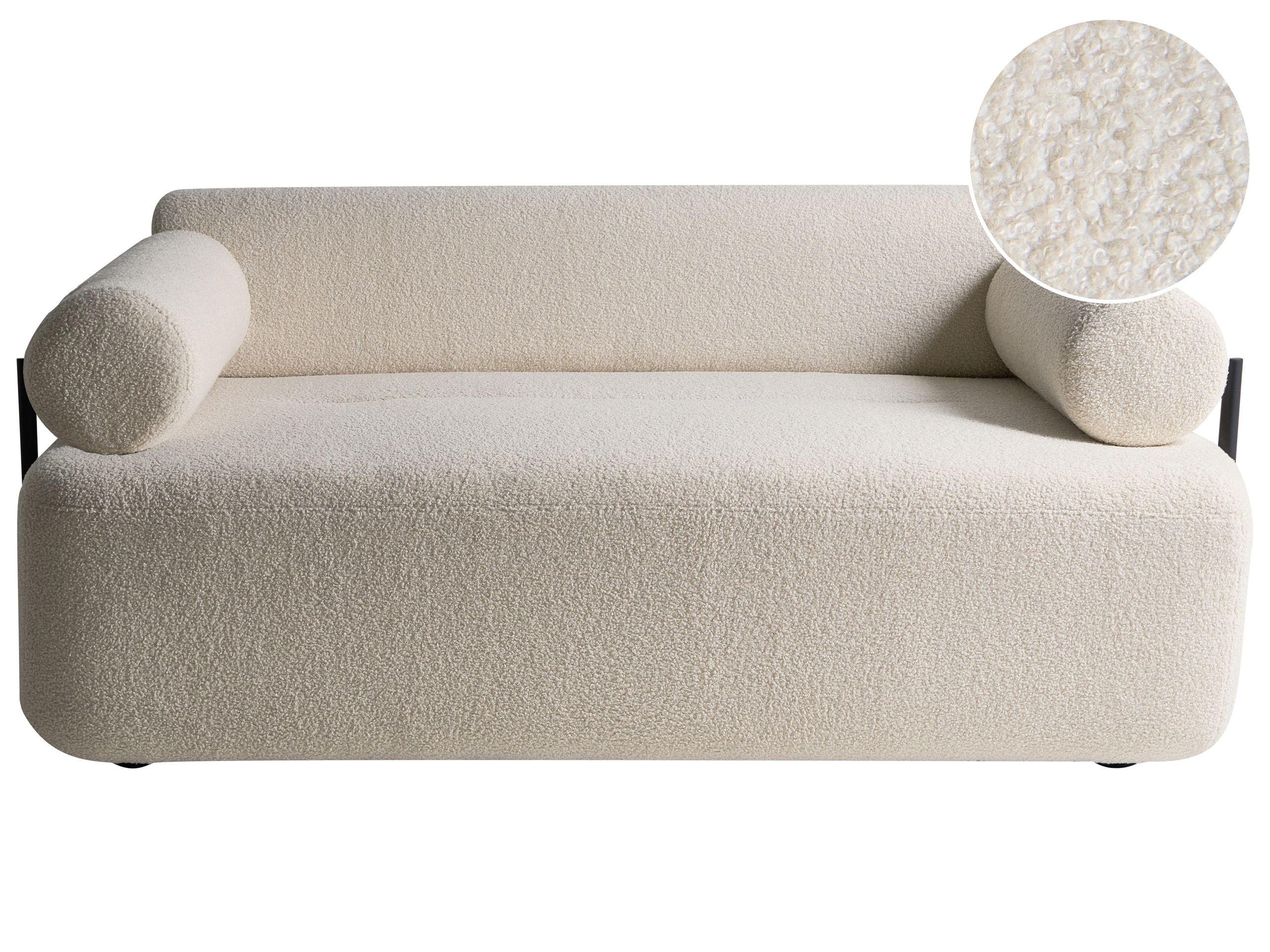 Modernes 2-Sitzer Bouclé-Polstersofa mit runden Armlehnen. Dieses Stoffsofa verfügt über ein originelles, modernes Design und eignet sich perfekt für stilbewusste Wohnräume, die Langlebigkeit, Eleganz und zurückhaltenden Charme miteinander verbinden möchten. Es punktet mit einer äusserst dick gepolsterten Sitzfläche, einer niedrigen Rückenlehne und runden Armlehnen, die an Kissenrollen erinnern. Der hochwertige Bouclé-Rundumbezug, überzeugt durch seine weiche, strukturierte Oberfläche, die sowohl Komfort als auch Gemütlichkeit ausstrahlt. Das Teddy-Sofa steht auf einem schwarzen Metallgestell, das über die Seitenteile und den Rücken des Sofas zu gleiten scheint, um so für einen unvergleichlichen, zeitgemässen Look und etwas Raffinesse zu sorgen.
