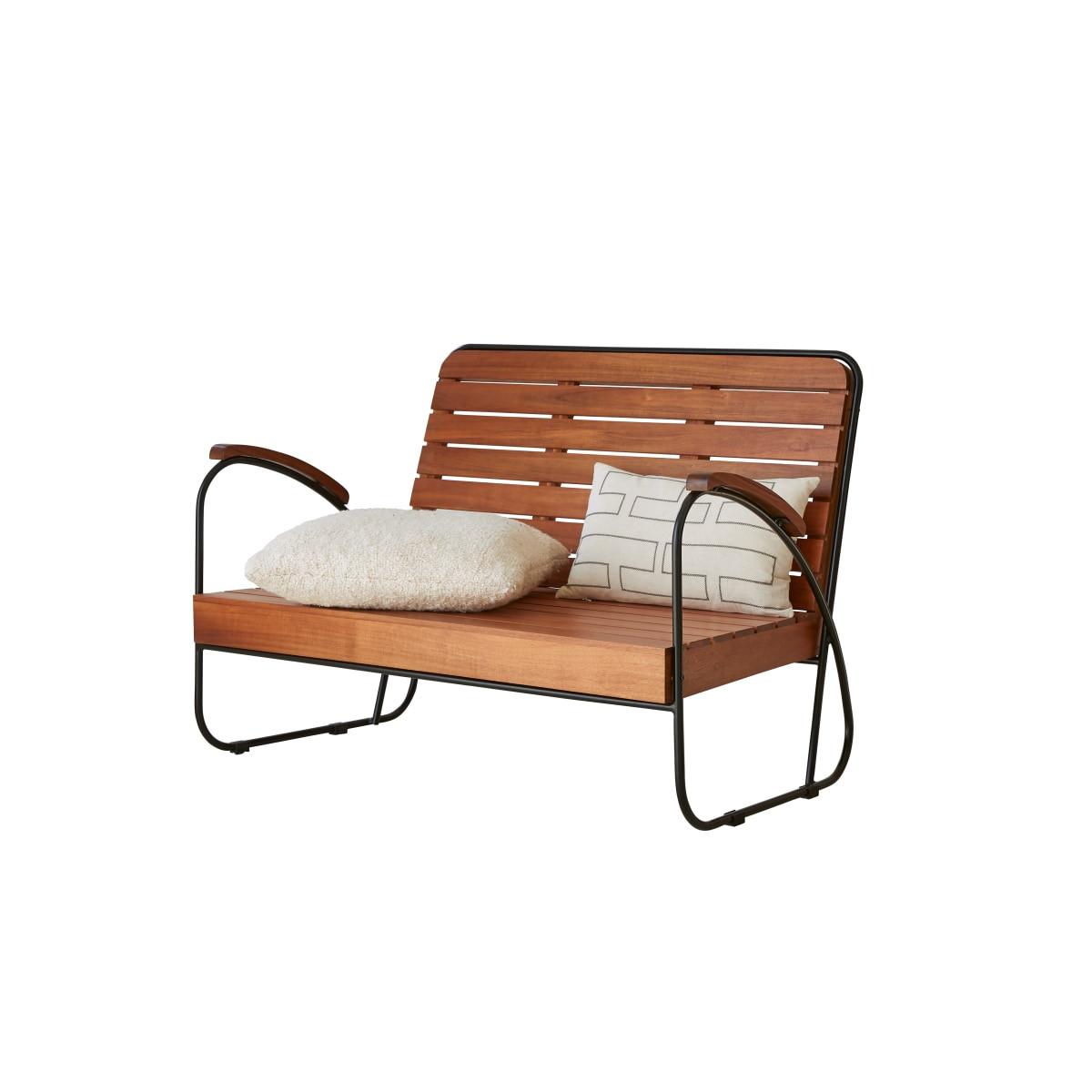 2-Sitzer-Bank aus massiven Akazienholzlatten mit FSC®-Zertifikat und Metallrohr.