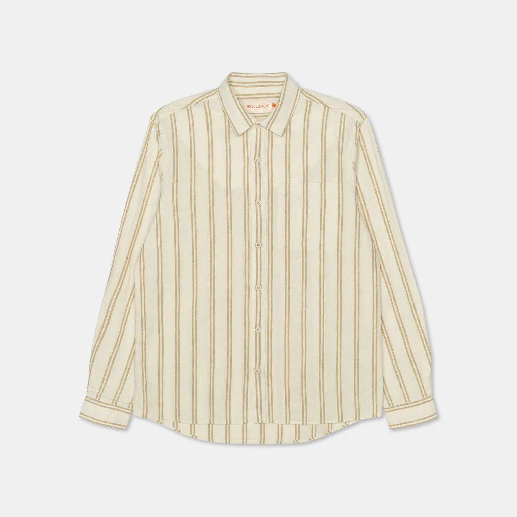 Dieses locker sitzende Hemd ist aus einem gestreiften Leinen-Baumwoll-Mischgewebe gefertigt. Es verfügt über einen klassischen Kragen und eine durchgehende Knopfleiste, die einen entspannten und dennoch raffinierten Look bietet. Das Design umfasst eine Brusttasche für zusätzliche Funktionalität und Stil sowie ein Markenetikett am unteren Ende der inneren Knopfleiste.