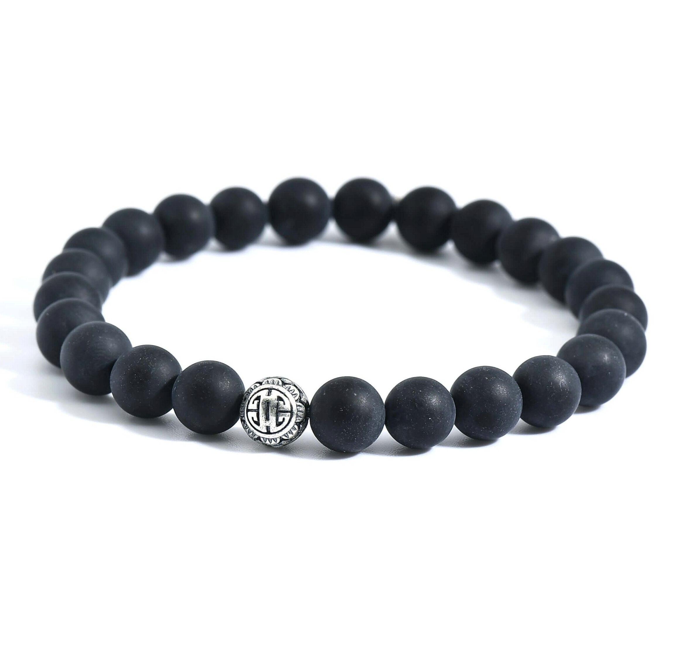 Herren Stretch Armband mit 8 mm mattem Onyx & gravierter 925 Silber Kugel Schlicht, Stark, Stilvoll