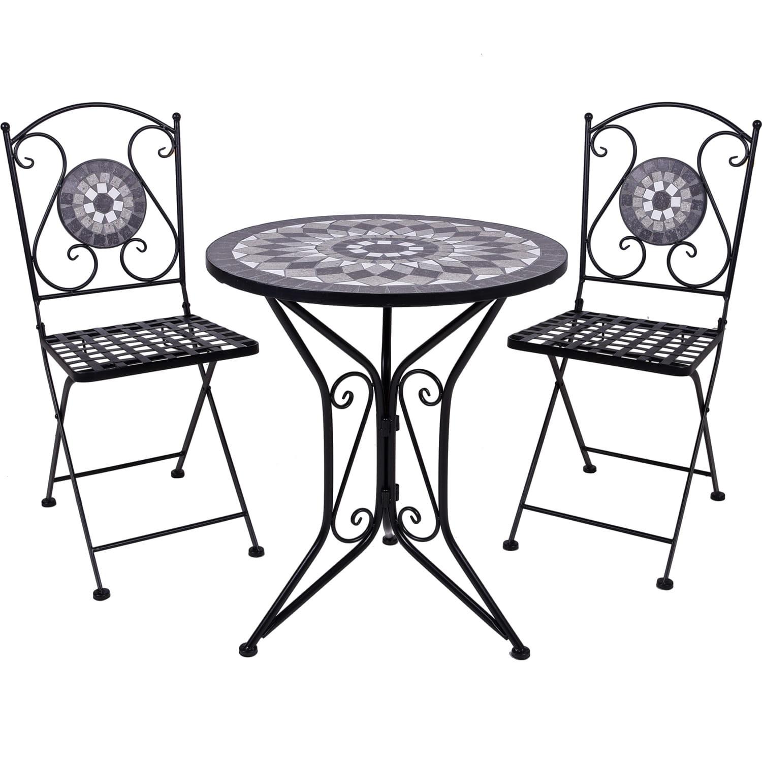 Stilvoller und funktionaler Outdoor-Sitz Robuste Stahlkonstruktion für Langlebigkeit Teilweise mit Keramikmosaik verzierte Rückenlehnen Tisch mit ausreichend Platz für Getränke, Snacks oder Bücher Leicht zu reinigen Zeitloser Grauton passt in jede Umgebung Stühle können für platzsparende Lagerung weggeräumt werden Maximale Belastbarkeit Tisch: 50 kg Maximale Belastbarkeit Stuhl: 120 kg