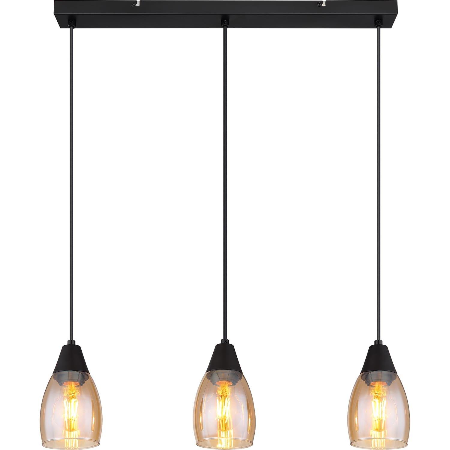 Hängeleuchte Metall schwarz matt, Glas rauchfarben, Metall holzoptik dunkel, Kabel PVC schwarz, LxBxH: 550x100x1200mm, exkl. 3x E27 40W 230V.