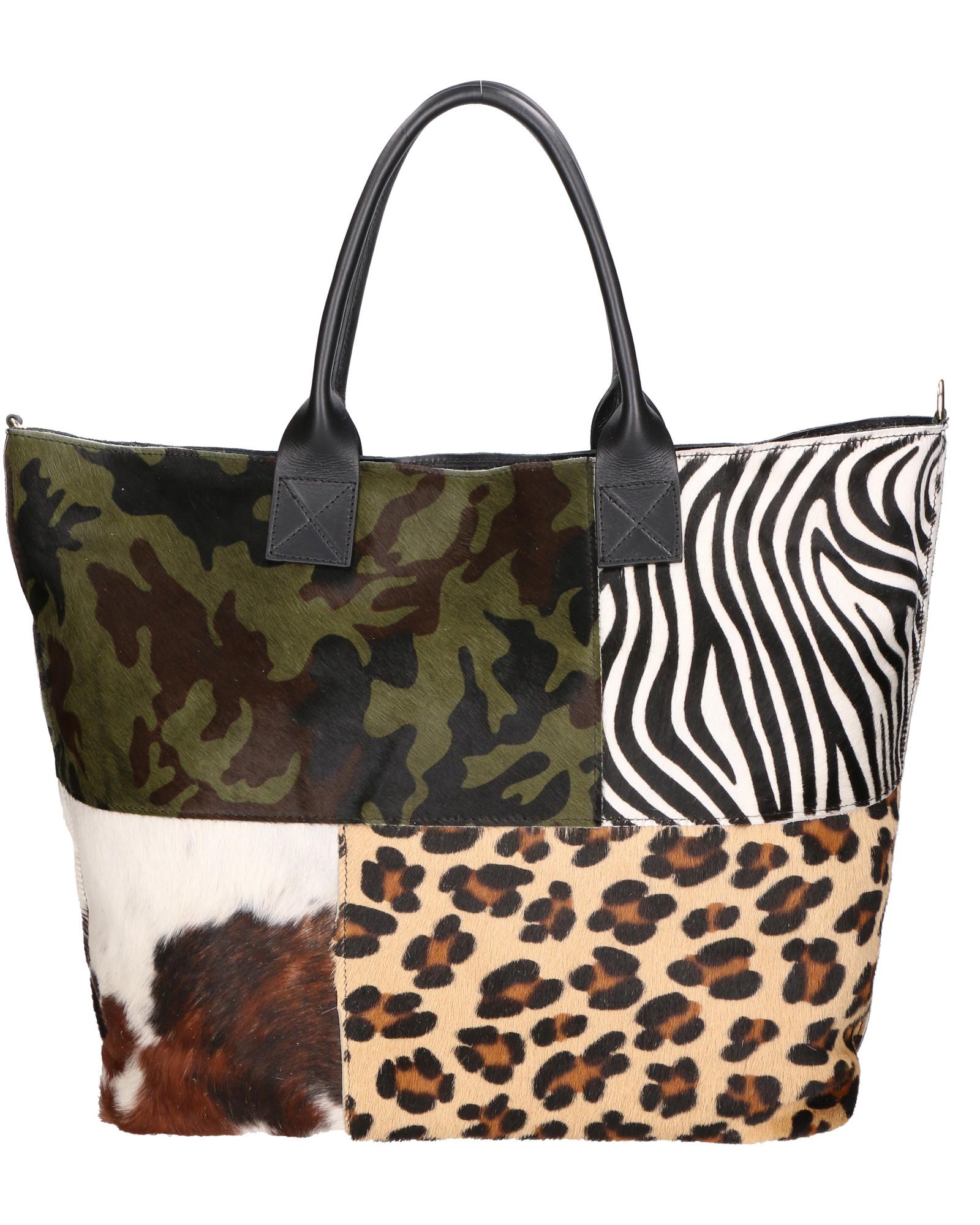 Shopper-Tasche mit Patchwork-Print aus Leder und Kalbshaar. Ausgestattet mit einem verstellbaren und abnehmbaren Schultergurt. Hergestellt in Italien