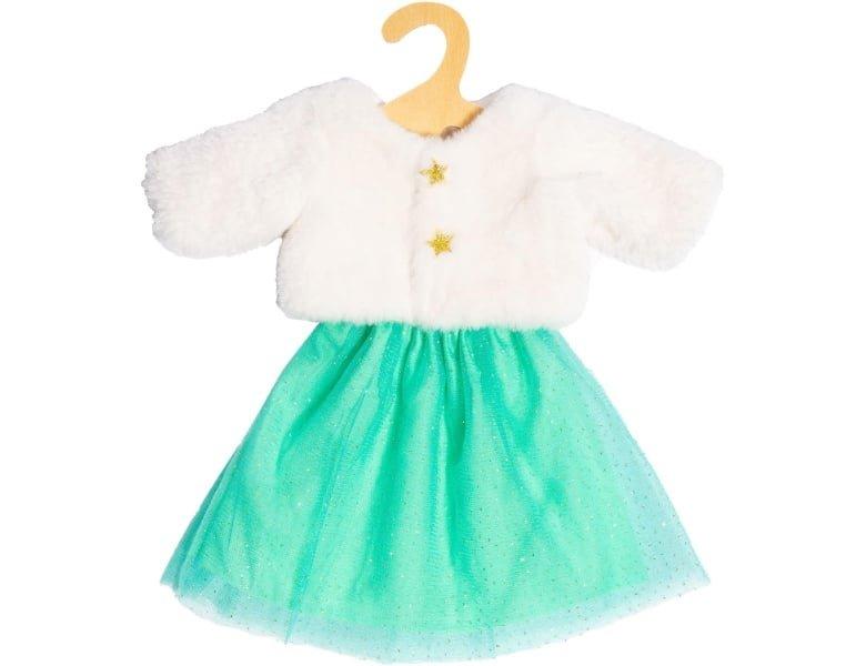 Dieses bezaubernde Set enthält eine weiche, weisse Plüschjacke mit aufgestickten Goldsternen sowie einen türkisfarbenen Tüllrock mit Glitzereffekt. Ideal für Puppen und Stofftiere von 28 bis 35 cm. Der Artikel wurde inklusive eines praktischen Holzkleiderbügels geliefert.