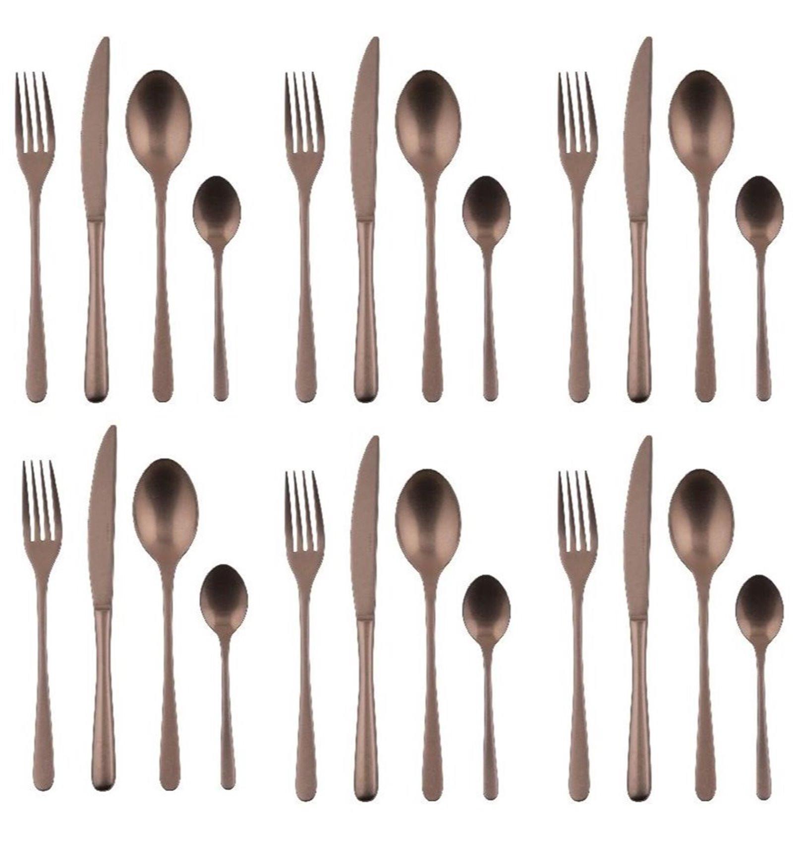 Art: Besteck-Set, Detailfarbe: Kupfer, Material: Edelstahl, Anzahl Teile: 24 Teile, Spülmaschinenfest: Ja, Beschichtung: PVD.