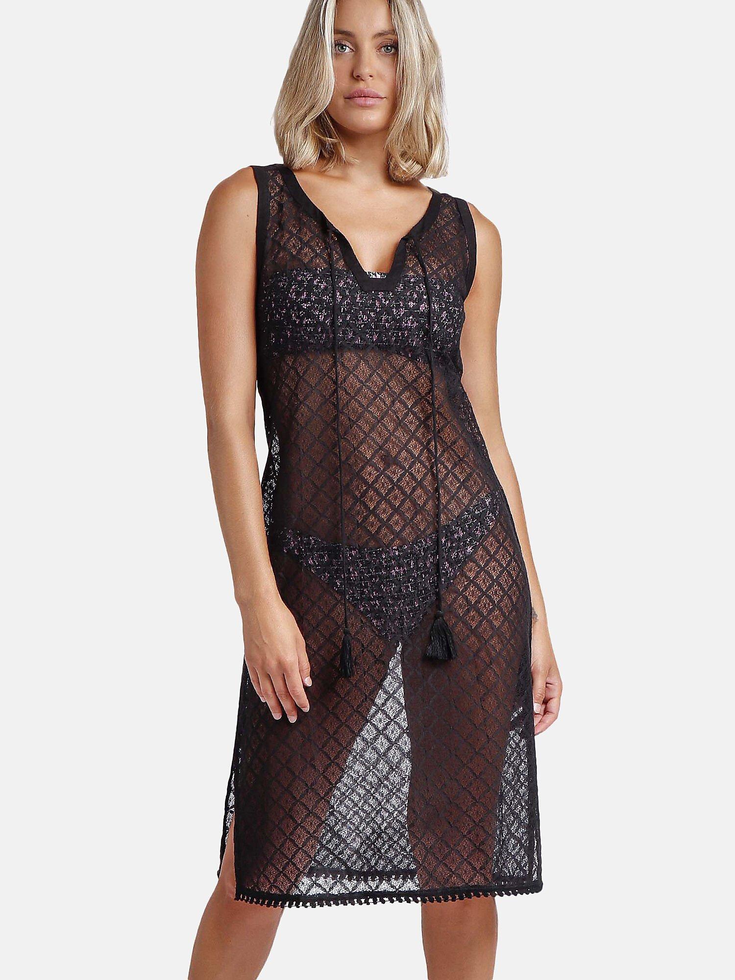 Strandtunika im Schnitt eines halblangen, ärmellosen Kleides aus gehäkelter Baumwolle, ultraleicht und transparent. Sie ist ideal, um sie über Ihrem Badeanzug zu tragen, den sie durchscheinen lässt, wenn Sie aus dem Wasser kommen oder an die Strandbar gehen. Seine Muster, seine Transparenz und sein V-Ausschnitt verleihen ihm einen ultra-femininen Look. Die Quastenbindungen werden am Halsausschnitt gebunden oder können je nach Stilwunsch freigelassen werden. Der Saum des Kleides ist mit feinen Pampillen besetzt, die einen schicken Boho-Touch verleihen und Ihren Sommerlook vervollständigen. Angenehm weicher Baumwollstoff, Schlitze an den Seiten.