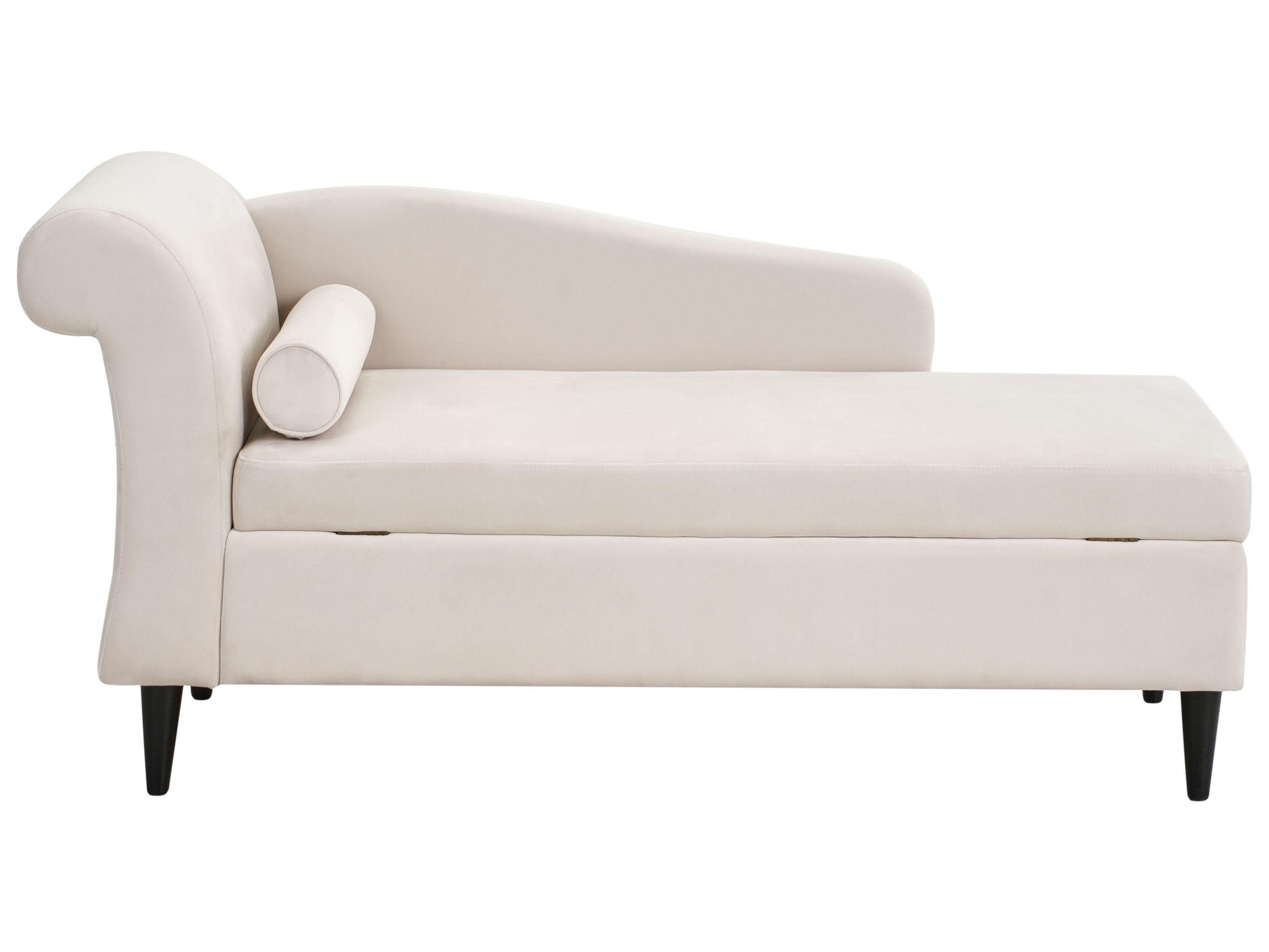 Stilvolle Samt-Chaiselongue mit Stauraum und Nackenrolle. Dieser Chaiselongue im klassischen Stil wird zu Ihrem neuen Lieblingsplatz im Wohnzimmer. Die längliche Form und die weiche Polsterung in edlem Beige sorgen für entspannte Wohlfühlmomente, perfekt für ein Nachmittags-Nickerchen. Das Highlight: der praktische Stauraum unter der Liegefläche, wo Sie allerlei Kleinigkeiten, Kissen oder Decken verstauen können.