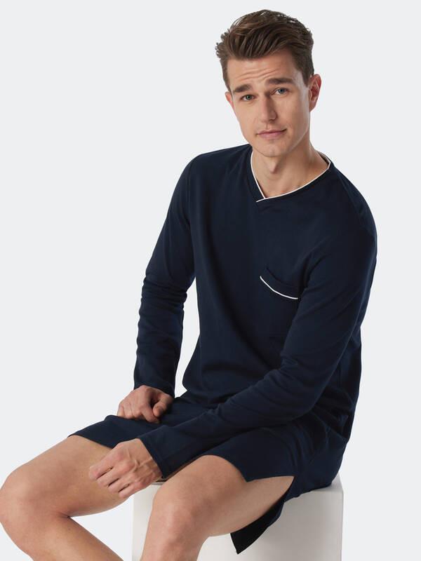 Dieses Langarm-Nachthemd bietet Komfort und ein klassisches Design für erholsame Nächte. Es verfügt über einen V-Ausschnitt mit kontrastierendem Besatz und eine Brusttasche, ebenfalls mit kontrastierendem Besatz, die dem Gesamtbild ein subtiles Detail verleiht. Die entspannte Passform sorgt für Bewegungsfreiheit und ein angenehmes Tragegefühl.