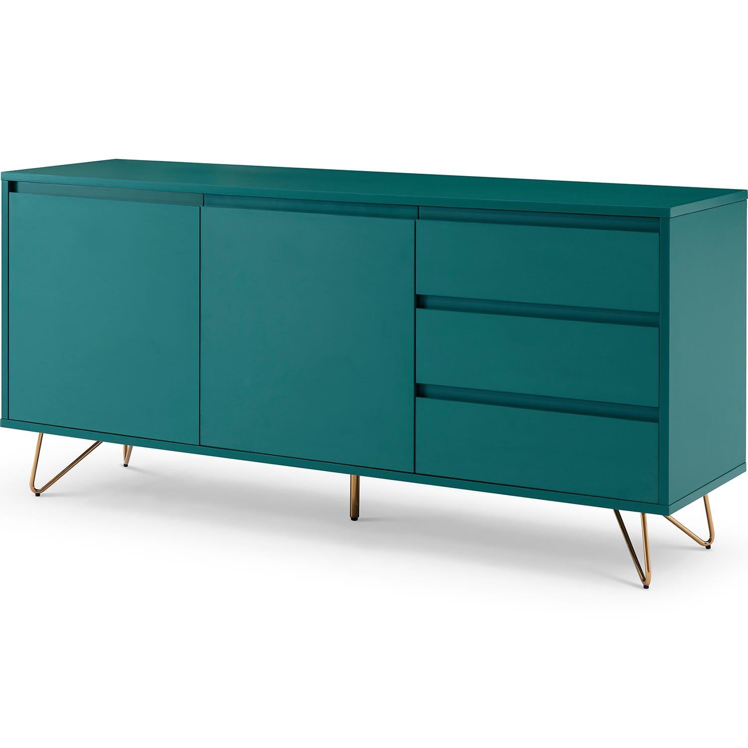 Ein echter Hingucker in Ihrem Wohnraum ist dieses Sideboard im skandinavischen Design. Die Kombination aus schlichten Farbtönen und goldenen Metallbeinen machen diese Kommode zu etwas ganz Besonderem. Dank zwei Schranktüren und drei ausziehbaren Schubladen erhalten Sie jede Menge stilvollen Stauraum für die alltäglichen Dinge. Hinter den beiden Türen verbergen sich zwei verstellbare Regalböden. Das moderne skandinavische Design dieses Sideboards ist auch morgen noch zeitgemäss und lässt sich wunderbar mit Ihren bereits vorhandenen Interior kombinieren.Stauraummasse Innenschublade: H10 x B47 x T35 cm, Masse Innenschrank B104 x T37 x H51 cm, mit 2 verstellbaren Regalablagen, 3 Schubladen ausziehbar, matt lackiert.Sideboard im skandinavischen Designin matt petroler Lackierungstylische Haarnadel-Beine mit Messinglegierungmit 2 Türen und 3 ausziehbaren Schubladen2 verstellbare Regalböden für mehr FlexibilitätSideboard aus MDF, Beine aus Metall mit Messinglegierung