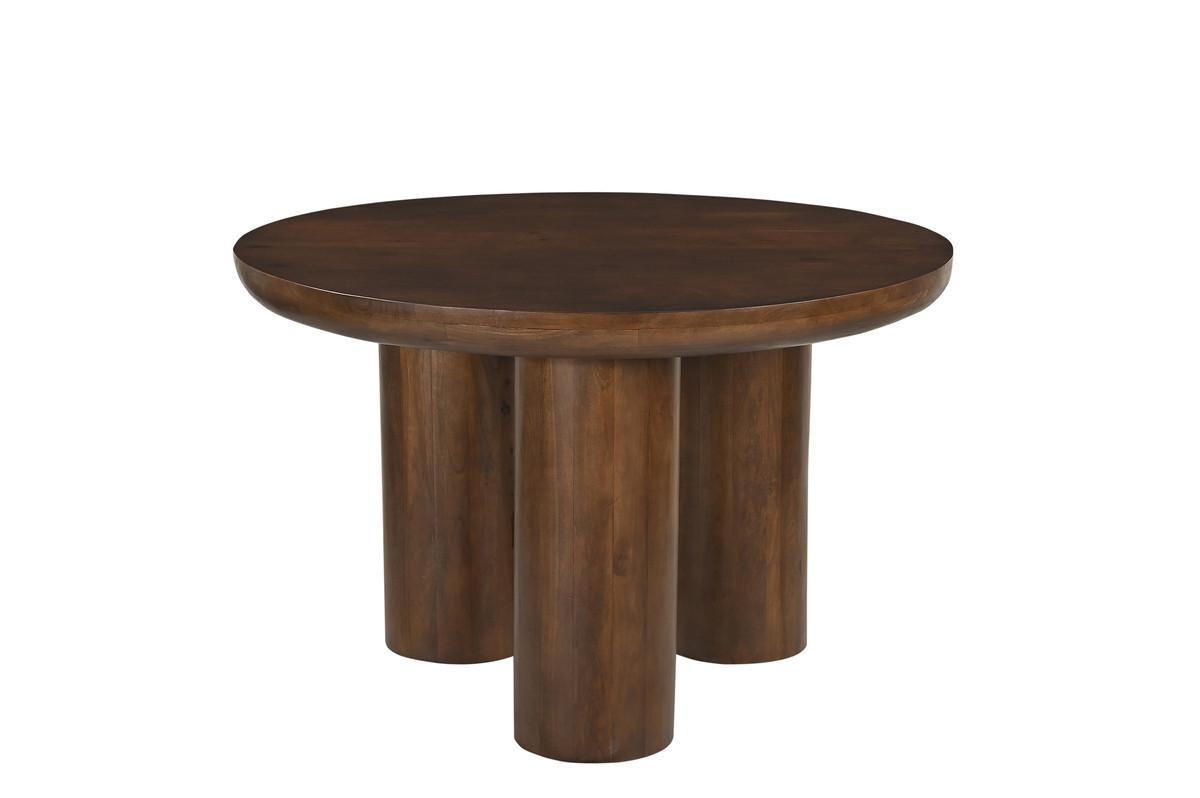 Material: Hochwertiges, massives Mangoholz Farbe: Einladendes Braun Runde Tischplatte: Ø 120 cm für gesellige Runden Plattenstärke: Robuste 8 cm Stabiles Gestell: Drei säulenförmige Beine Vielseitig einsetzbar: Passend für Esszimmer oder Wohnküchen Höhe: 76 cm, ideal für komfortables Sitzen
