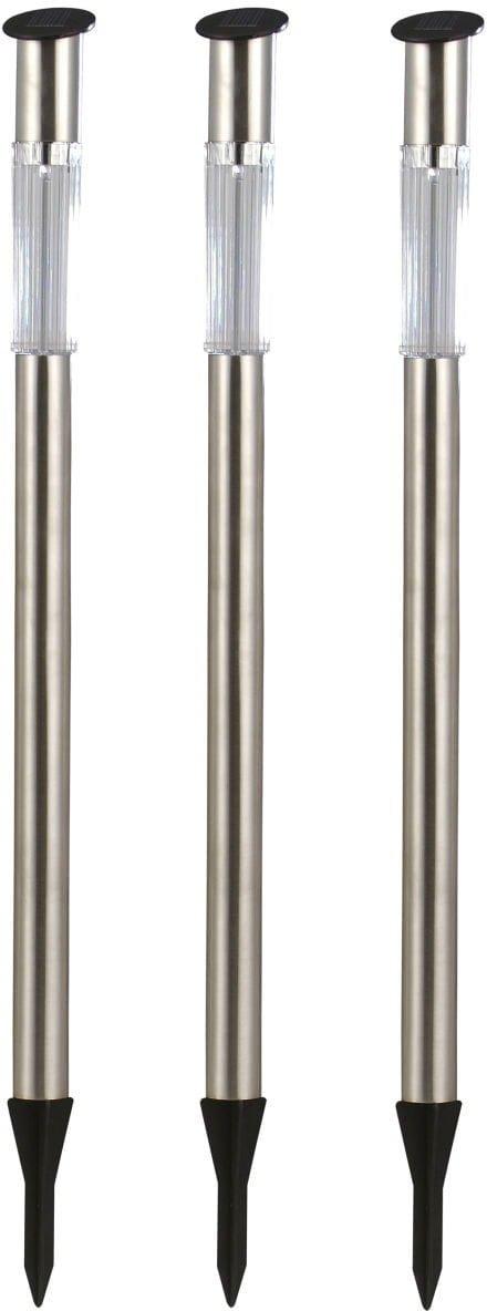 Diese formschönen Solarlampen aus Edelstahl im 3er Set zeichnen sich durch modernes, stilvolles Design aus. Der klare Kunststoff-Leuchtspot sorgt für die optimale Beleuchtung. Dank der IP44 Schutzart eignet sich dieses 70 cm grosse Produkt vor allem für den Aussenbereich.