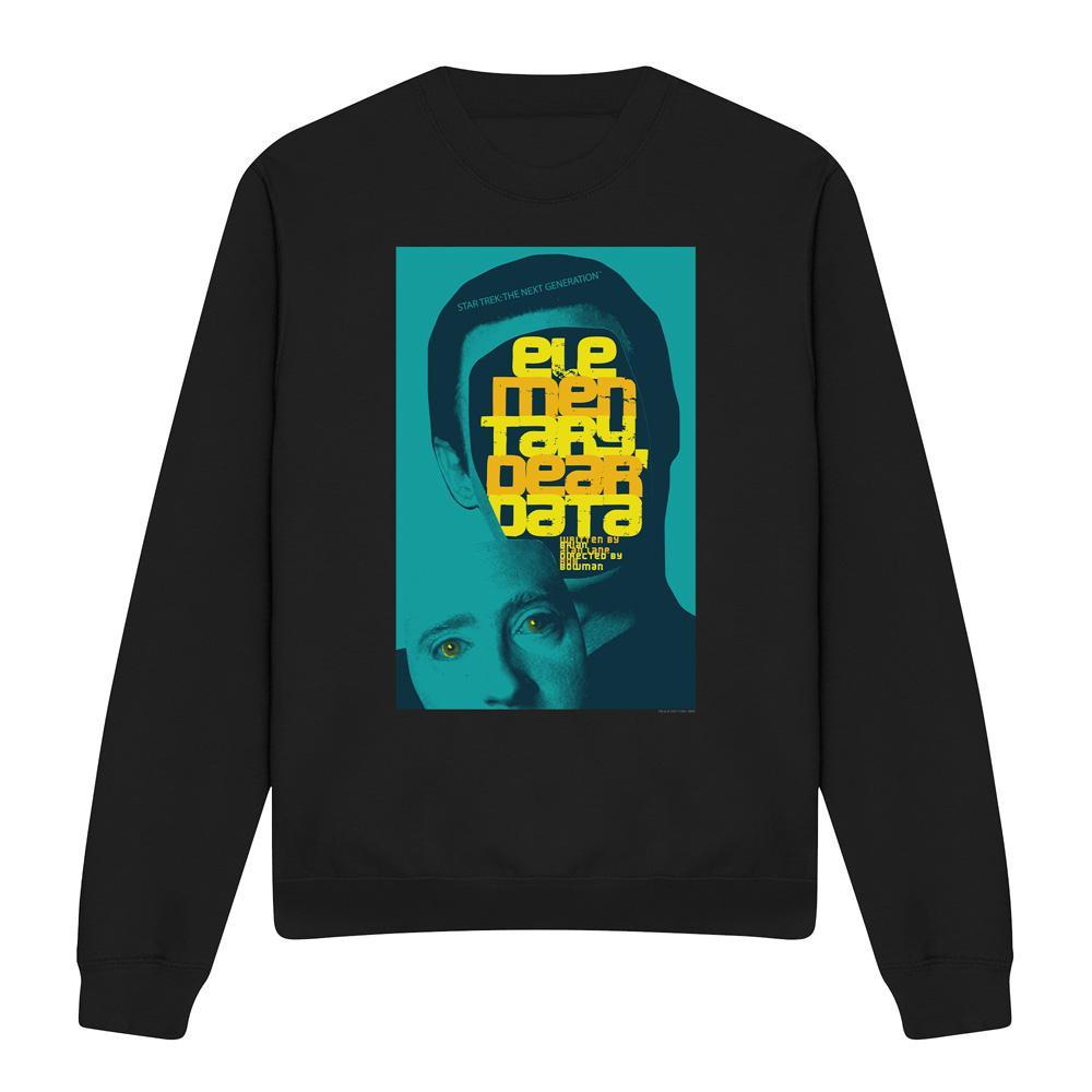 Dieses Sweatshirt zeigt einen einzigartigen Grafikdruck, inspiriert von "Star Trek: The Next Generation" Staffel 2 Episode 3. Das Design präsentiert eine stilisierte Darstellung von Datas Gesicht mit dem Episodentitel "Elementary Dear Data", der prominent in einer kräftigen, gelben Schrift angezeigt wird. Das schwarze Sweatshirt bietet einen auffälligen Kontrast zur lebendigen blauen und gelben Grafik und macht es zu einem herausragenden Stück für Fans.