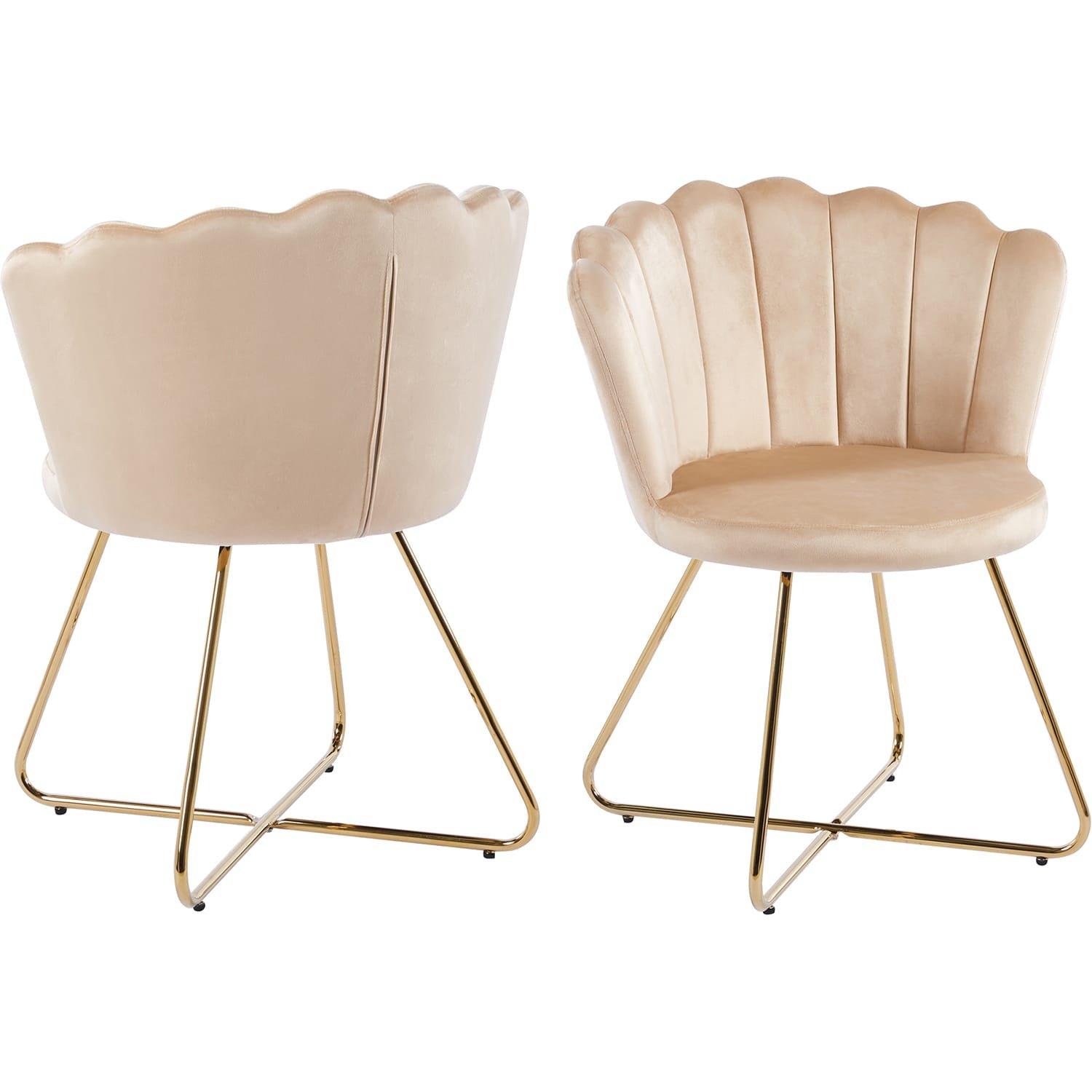 Entfliehen Sie dem Alltag und geniessen Sie eine kleine Auszeit. Das moderne Stuhl-Set im Muschel-Design besticht durch seinen Bezug aus Samt und überzeugt mit seinem abgerundeten Sitz- und Rückenbereich. Das überkreuzte Design-Gestell aus vergoldetem Metall gewährleistet nicht nur einen sicheren Stand, sondern bietet auch einen grossartigen Kontrast zum Bezug des Stuhls. Durch die Polsterung an Sitz- und Rückenfläche und die stylische Form erleben Sie erstklassigen Sitzkomfort. Die abgerundete Form sorgt für einen weichen Look. Der Stuhl kann im Speisezimmer als Esszimmerstuhl oder zum Beispiel als Sitzgelegenheit am Schminktisch dienen. Egal wo er platziert wird, dieser Muschelstuhl ist ein echter Blickfang.Beine Chrom goldfarbenSitzhöhe: 47,5 cmSitztiefe: 48,5 cmSitzbreite: 54,5 cmAbstand zwischen den Beinen: vorne ca. 50 cm, seitlich ca. 50,5 cmDicke des Sitzkissens: ca. 7 cmHöhe der Rückenlehne: ca. 37,5 cmmax. Belastbarkeit: ca. 150 KGkeine Unterfederung, keine FederungSitzkomfort mittelfest, kein geschäumter KunststoffBezug aus hochwertigem Samtveloursüberkreuzte Chromfüsse in Gold sorgen für einen filigranen Look