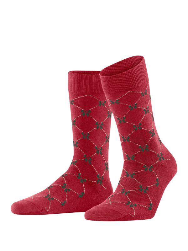 Diese festlichen Socken verfügen über ein charmantes Weihnachtsmuster, das jedem Outfit einen Hauch von Weihnachtsstimmung verleiht. Das Design umfasst ein sich wiederholendes Motiv aus Schleifen und ein Rautenmuster, das einen klassischen und eleganten Look erzeugt.