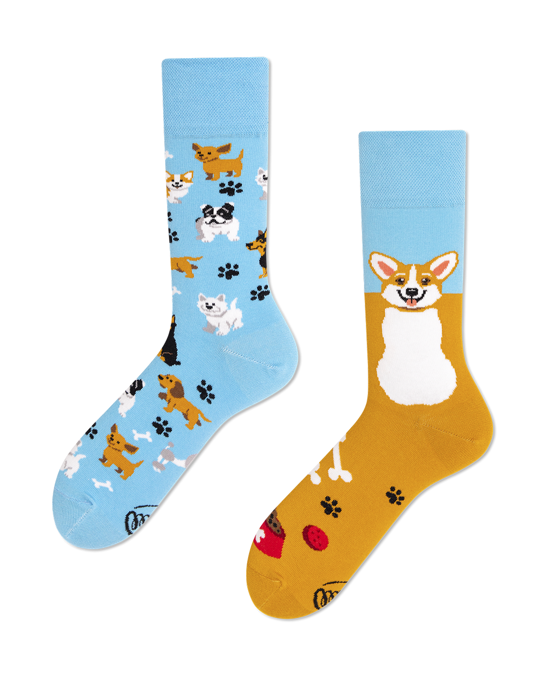 Diese verspielten Socken zeigen ein entzückendes Hundethema, perfekt, um jedem Outfit einen Hauch von Spass zu verleihen. Eine Socke zeigt eine Vielzahl kleiner Hunderassen, Pfotenabdrücke und Knochen auf hellblauem Hintergrund, während die andere Socke einen grossen, lächelnden Corgi auf senfgelbem Hintergrund zeigt. Beide Socken sind mit einem kontrastierenden hellblauen Bündchen versehen.