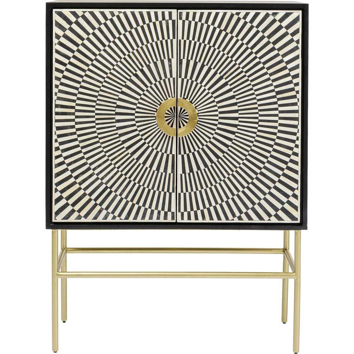 Die Kombination aus Schwarz und Weiss steht für Klassik und Moderne, oder lassen wir es Mode-Ikone Coco Chanel sagen: Schwarz hat einfach alles. Weiss ebenso. Die Schönheit dieser Farben ist absolut, ihre Harmonie perfekt. Dieser edle Barschrank krönt optisch die Wohnzimmereinrichtung und signalisiert: Hier ist gehobener Lebensstil zuhause. Aufgrund der Fertigung von Hand und der Verwendung von Naturmaterialien kann jedes Modell Abweichungen von der Abbildung aufweisen, ein Zeichen unverfälschter Handarbeit.Luxuriöser Wohnzimmer-Schrank im Zebra-Look mit goldfarbenem, lackiertem Gestell und rundem Griff.Ob die psychedelische Wirkung wohl am Gin-Tonic oder eher dem Muster liegt?Barschrank mit Platz für Gläser und die Gin-Sammlung auf 3 BödenMagic: Die Türfronten sind mit Intarsienarbeiten in Schwarz und Weiss in bester Handwerkstradition gearbeitet. Jedes Stück ein UnikatAls Geschirrschrank im Esszimmer ein Eyecatcher, der stilistisch ins Schwarze trifftSie suchen ein würdiges Zuhause für die Handtaschen? Dann verleihen Sie dem Ankleidebereich mit diesem Meisterstück ein Upgrade!Produktinformation Korpus: Eukalyptus mitteldichte Faserplatte lackiert, Front: Polyresin, Büffelknochen, Fuss/Füsse: Stahl pulverbeschichtet, Gestell: 15 kg max. Belastbarkeit, handgearbeitet, Lieferung zerlegt, mit Auslass 5 cm