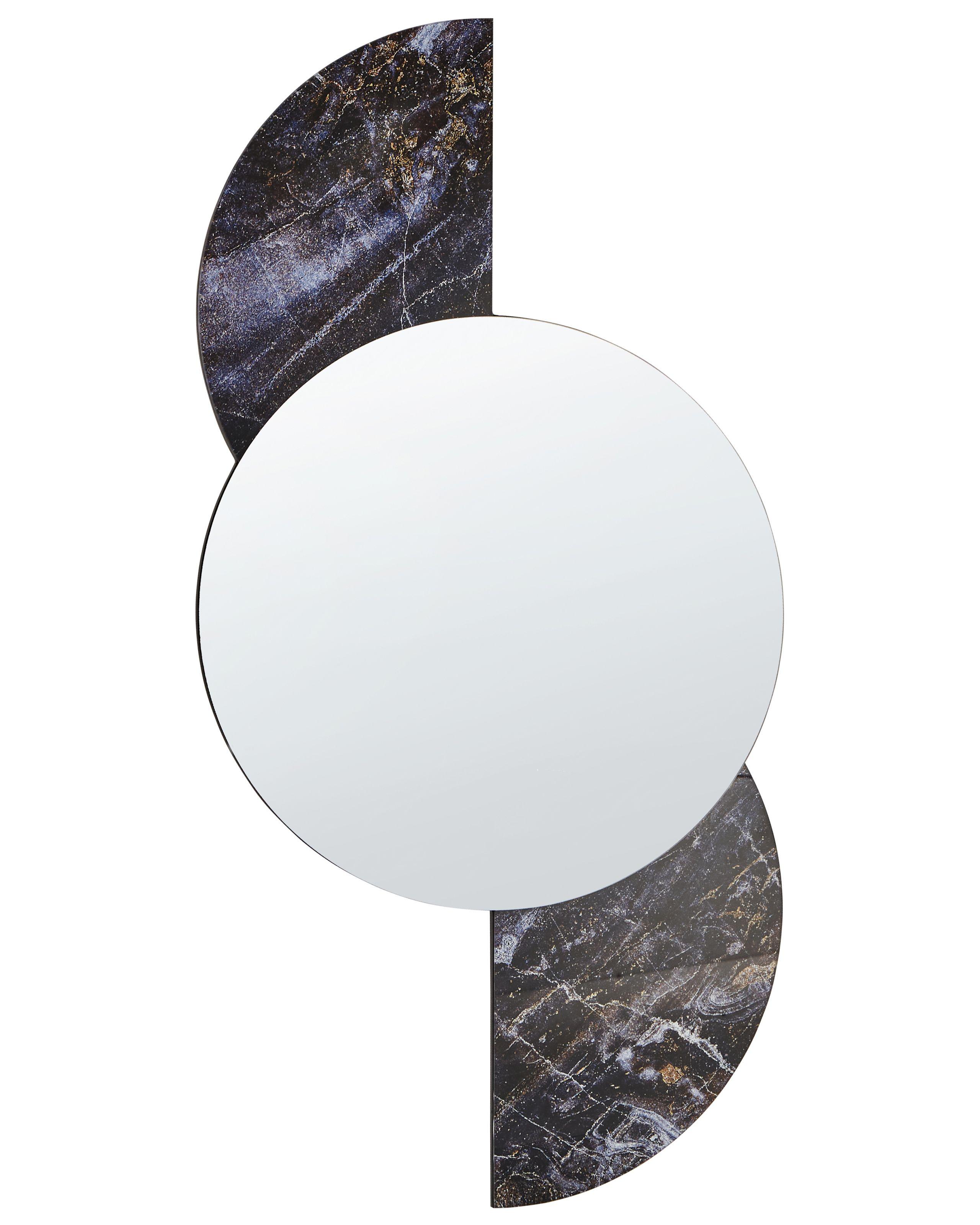 Moderner, runder Hängespiegel mit zwei halbrunden Deko-Elementen. Mit seiner unvergleichlichen Optik bringt dieser stilvolle Spiegel etwas Magie in Ihre Wohnräume. Seine runde, ebene Spiegelfläche ist mit zwei halbrunden Details in einer edlen Galaxie-Optik ergänzt. Diese originelle Formen- und Design-Kombination zieht jeden Blick direkt auf sich und sorgt für einen luxuriösen Look auf Ihren Wandflächen. Er eignet sich perfekt für Wohn- und Schlafzimmer oder Flure und verfügt über praktische Aufhänger auf der Rückseite.
