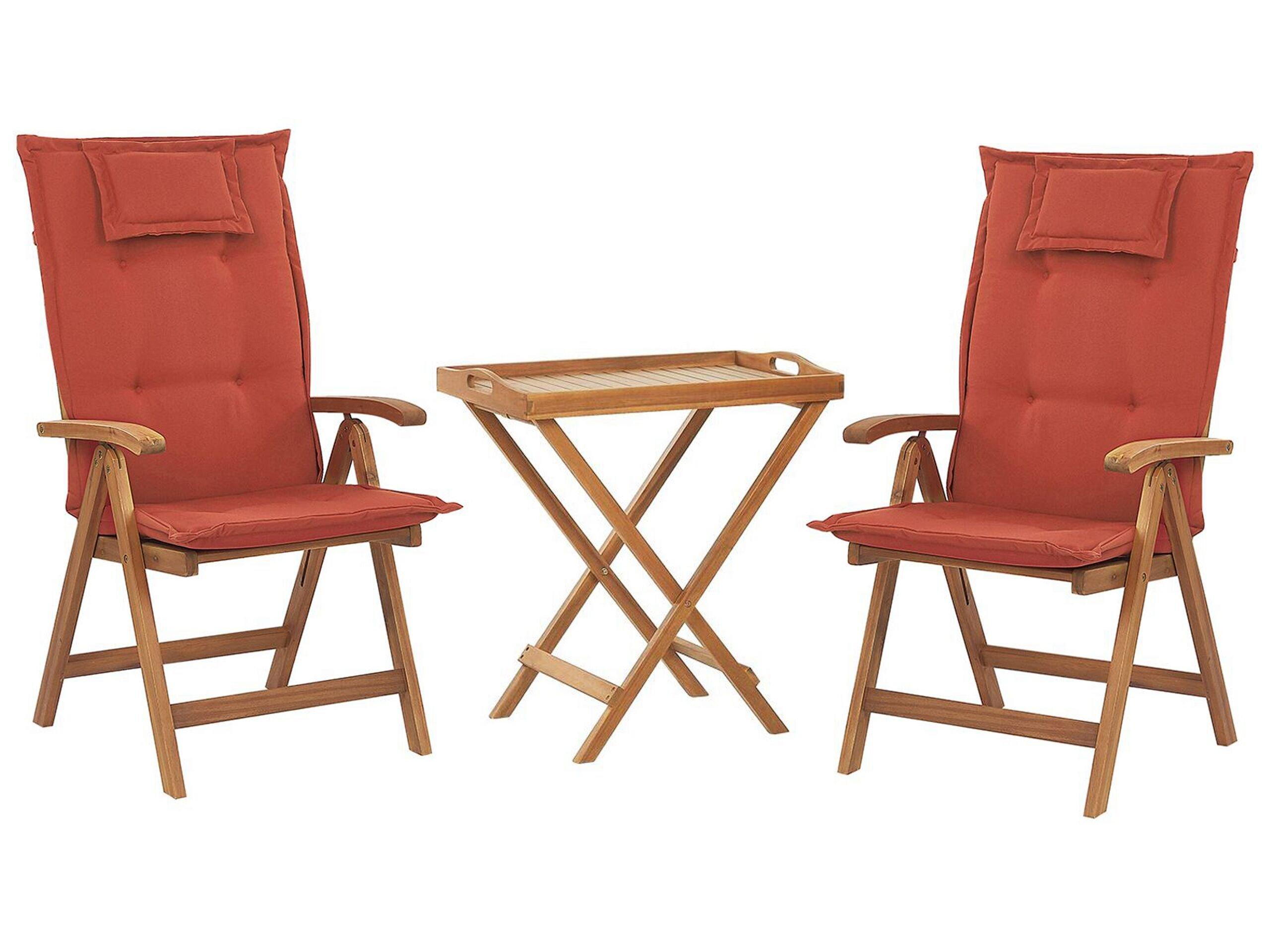 Zusammenklappbares Balkonset mit bequemen Sitzpolstern in Terracotta. Ein wunderschönes Gartentischset aus edlem Akazienholz für Ihre Terrasse, eine romantische kleine Ecke in Ihrem Garten oder auf einen Balkon! Sowohl die Stühle als auch der Tisch sind klappbar und können platzsparend weggestellt werden. Pflegeleichtes Material und eine natürliche und zeitlose Ausstrahlung überzeugen bei diesem praktischen kleinen Gartentischset.