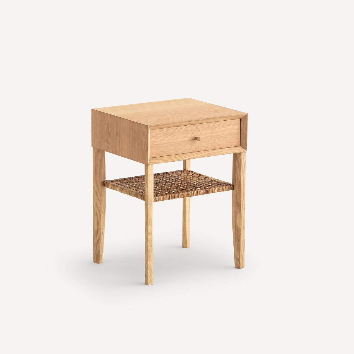 Nachttisch Dawud. Dieser kompakte Nachttisch punktet mit der gelungenen Verbindung von massivem Eichenholz und Rattan.