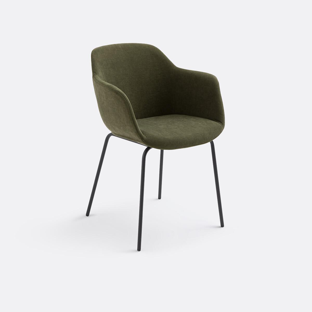 Umhüllende und einladende Form, schlankes und minimalistisches Gestell, Bezug aus strukturiertem Stoff. Das ist Halva, der Esszimmerstuhl im Vintage-Stil. Nehmen Sie Platz, gleich gibt es Essen.