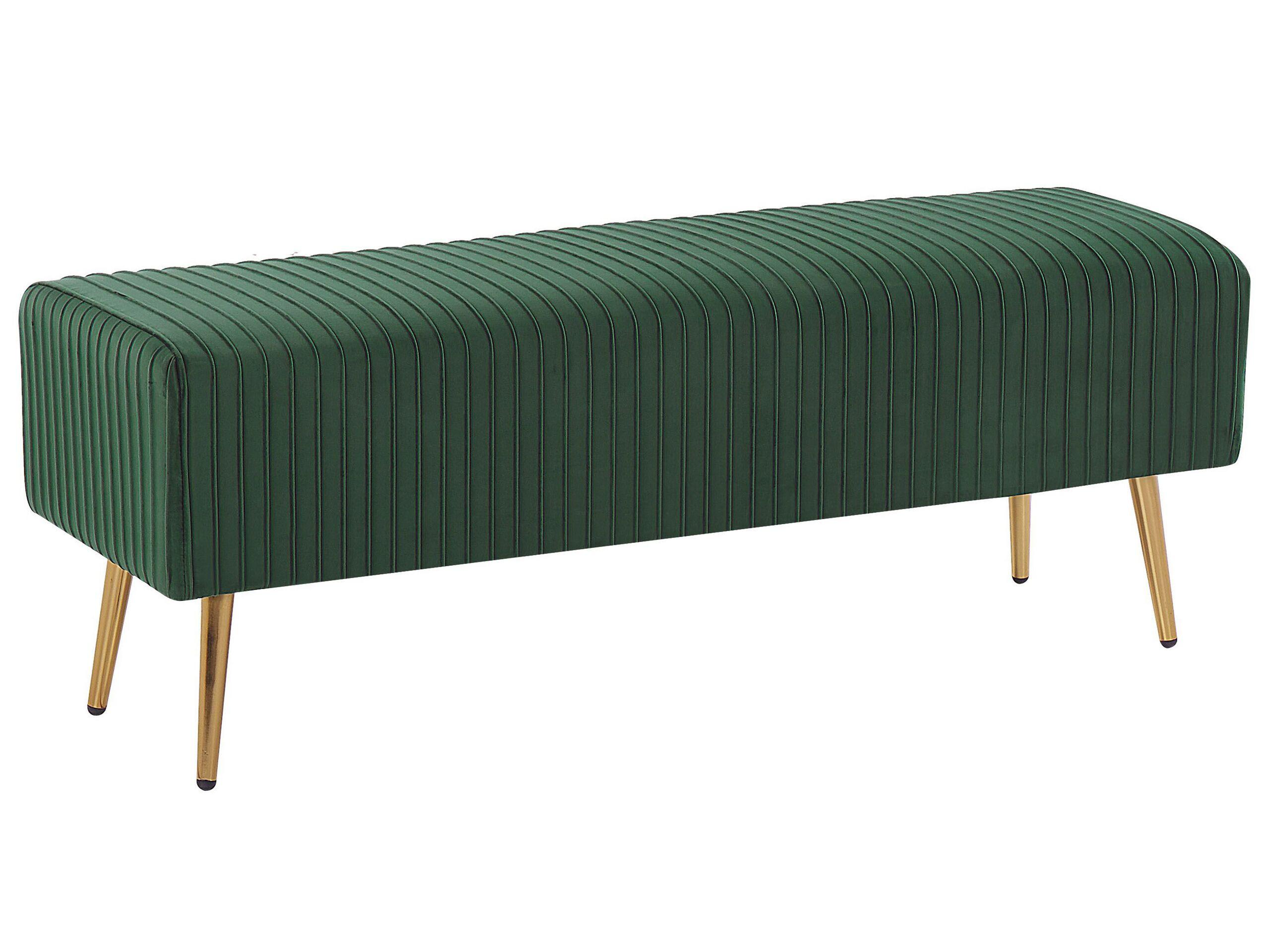 Smaragdgrüne Bank mit Metallbeinen im eleganten Design. Die funktionale und schicke Bank verleiht jedem Interieur einen Hauch von Glamour. Dieses Stück bezaubert nicht nur mit seiner gestreiften Struktur und eleganten Design, sondern auch mit hochwertiger Verarbeitung aus weichem Samtstoff, der perfekt mit goldenen Metallbeinen kombiniert ist. Die Bank eignet sich gut als Fusshocker, am Ende des Bettes oder als zusätzlicher Sitzplatz, was sie ideal für Wohnzimmer, Schlafzimmer und Flur macht.