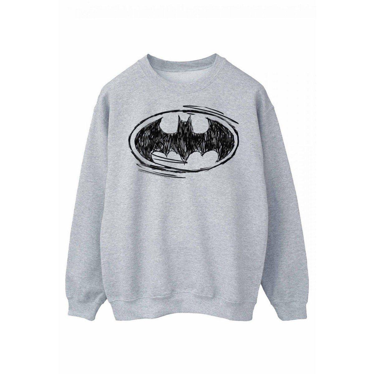 Dieses Sweatshirt verfügt über ein klassisches Rundhalsdesign und lange Ärmel, die eine bequeme und entspannte Passform bieten. Die Vorderseite ist mit einem markanten Batman-Logo verziert, das in einem skizzierten Stil innerhalb eines ovalen Rahmens präsentiert wird und dem Kleidungsstück ein einzigartiges grafisches Element verleiht.