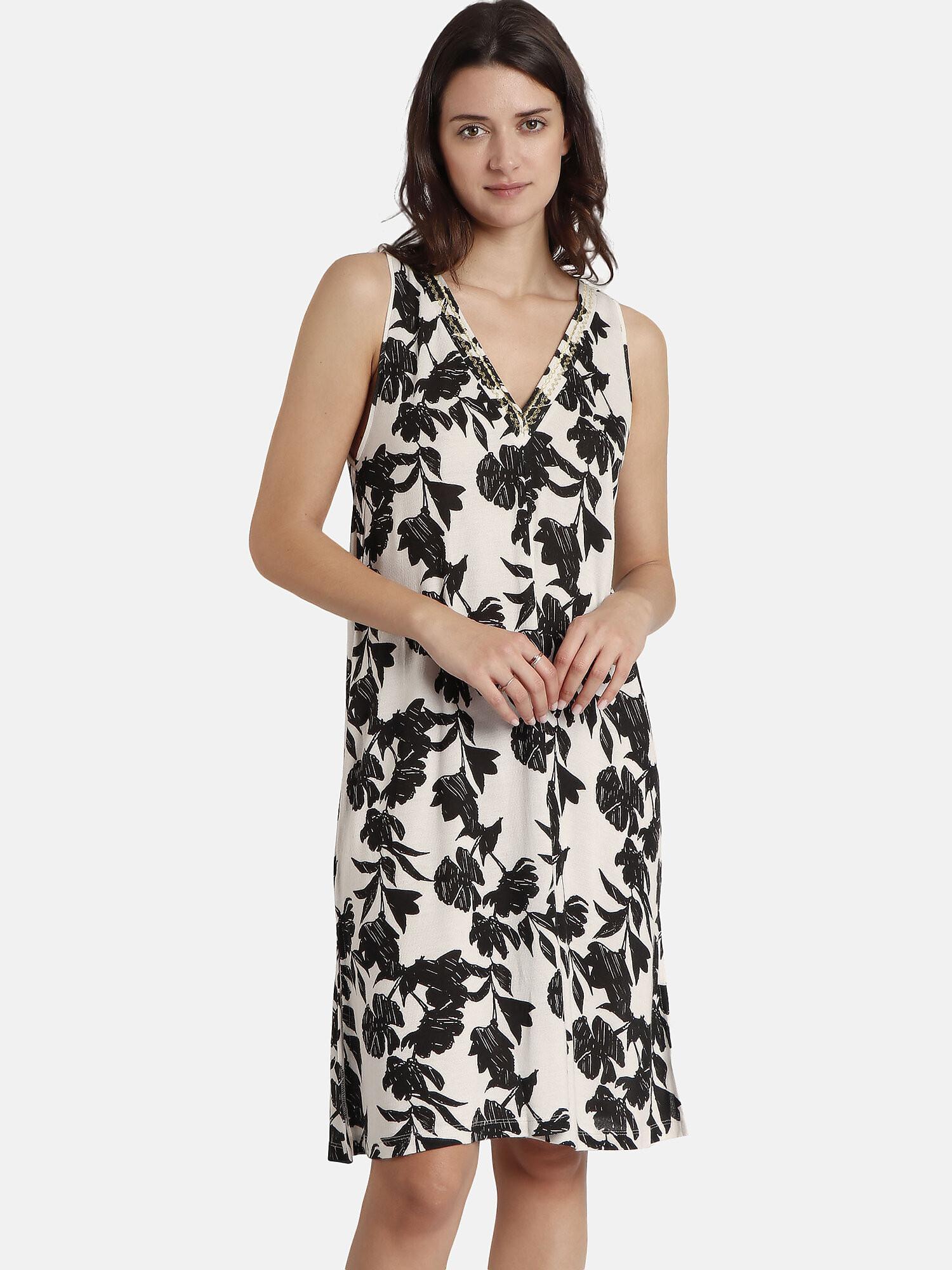 Sommerkleid mit geradem Schnitt, fließend und leicht, ultrabequem, ideal zum Tragen sowohl im Sommerurlaub als auch an sommerlichen Tagen bei der Arbeit. Wunderschöner, schicker und eleganter Blumenprint für einen wunderschönen Look, egal ob am Strand oder in der Stadt. Der V-Ausschnitt wird von sehr feinen goldenen Stickereien mit Stepp-Effekt unterstrichen. Ärmellos, V-Ausschnitt, fließendes, angenehm zu tragendes Viskosegewebe.