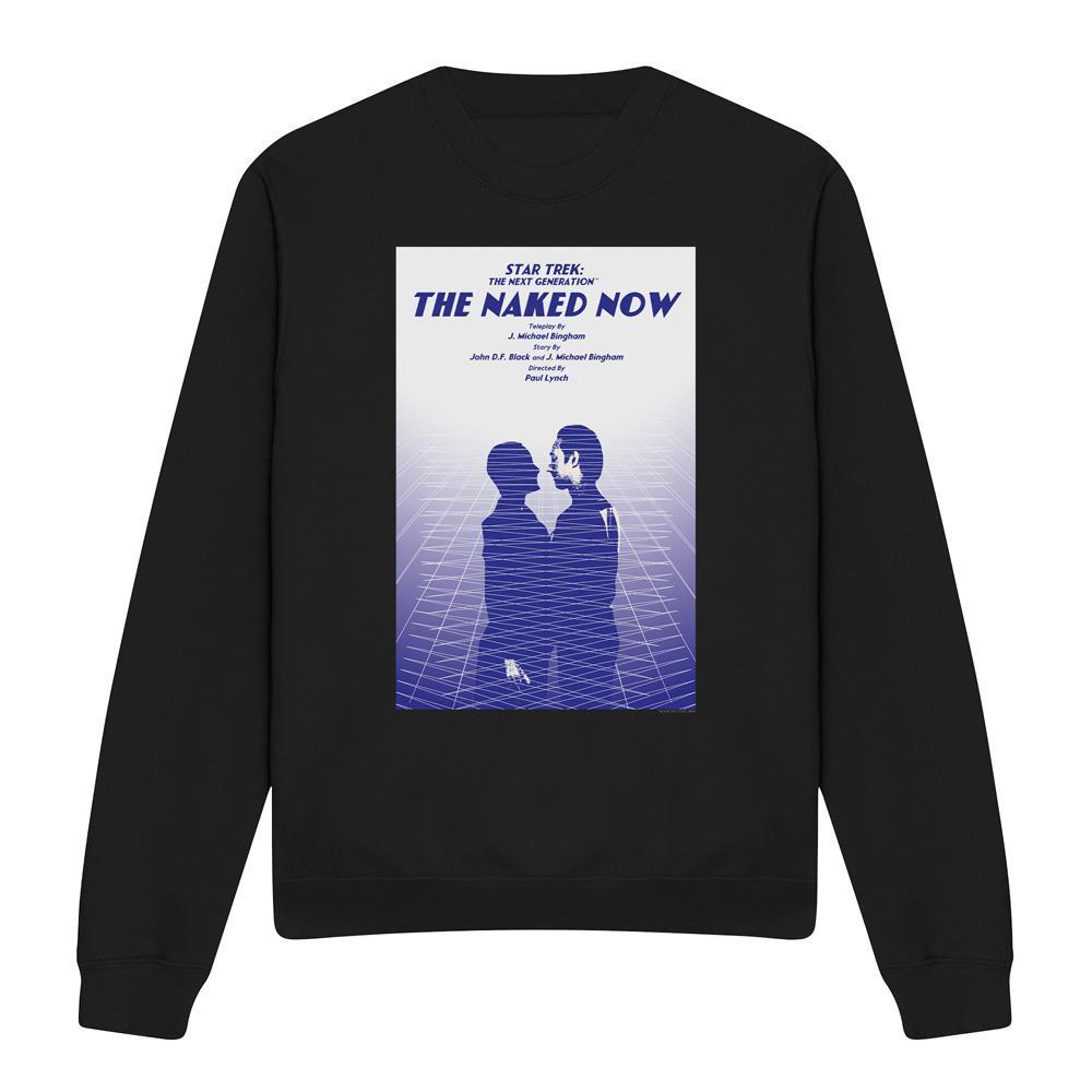Dieses Sweatshirt zeigt einen Grafikdruck, inspiriert von «The Naked Now», der dritten Episode der ersten Staffel von Star Trek: The Next Generation. Das Design fängt die Essenz der Episode mit einer stilisierten Darstellung von zwei Figuren vor einem Rasterhintergrund ein und spiegelt die Themen der klassischen Science-Fiction-Serie wider.