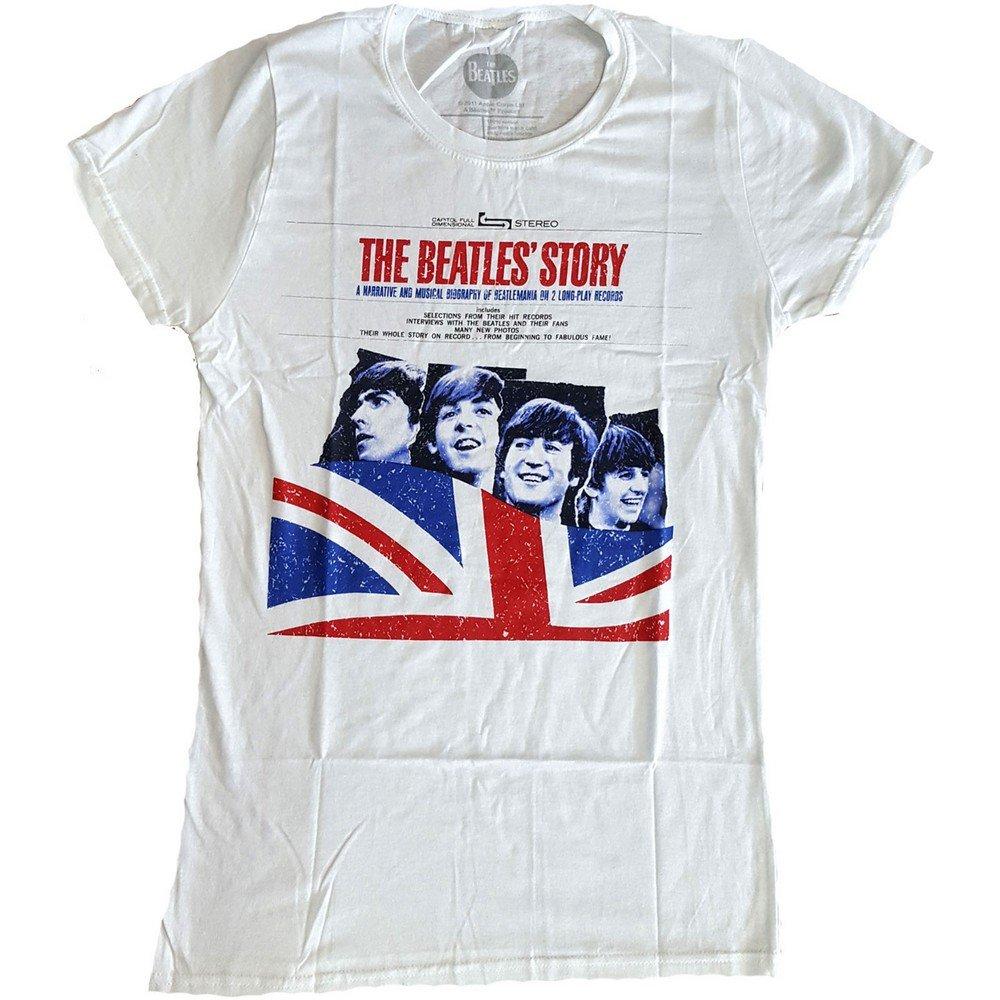 Dieses T-Shirt zeigt einen grafischen Druck, der von "The Beatles' Story" inspiriert ist, einer narrativen und musikalischen Biografie der Beatlemania. Das Design umfasst ein klassisches Bild der Bandmitglieder zusammen mit Elementen, die an die Union Jack Flagge erinnern. Es ist zu 100% offiziell lizenziert.