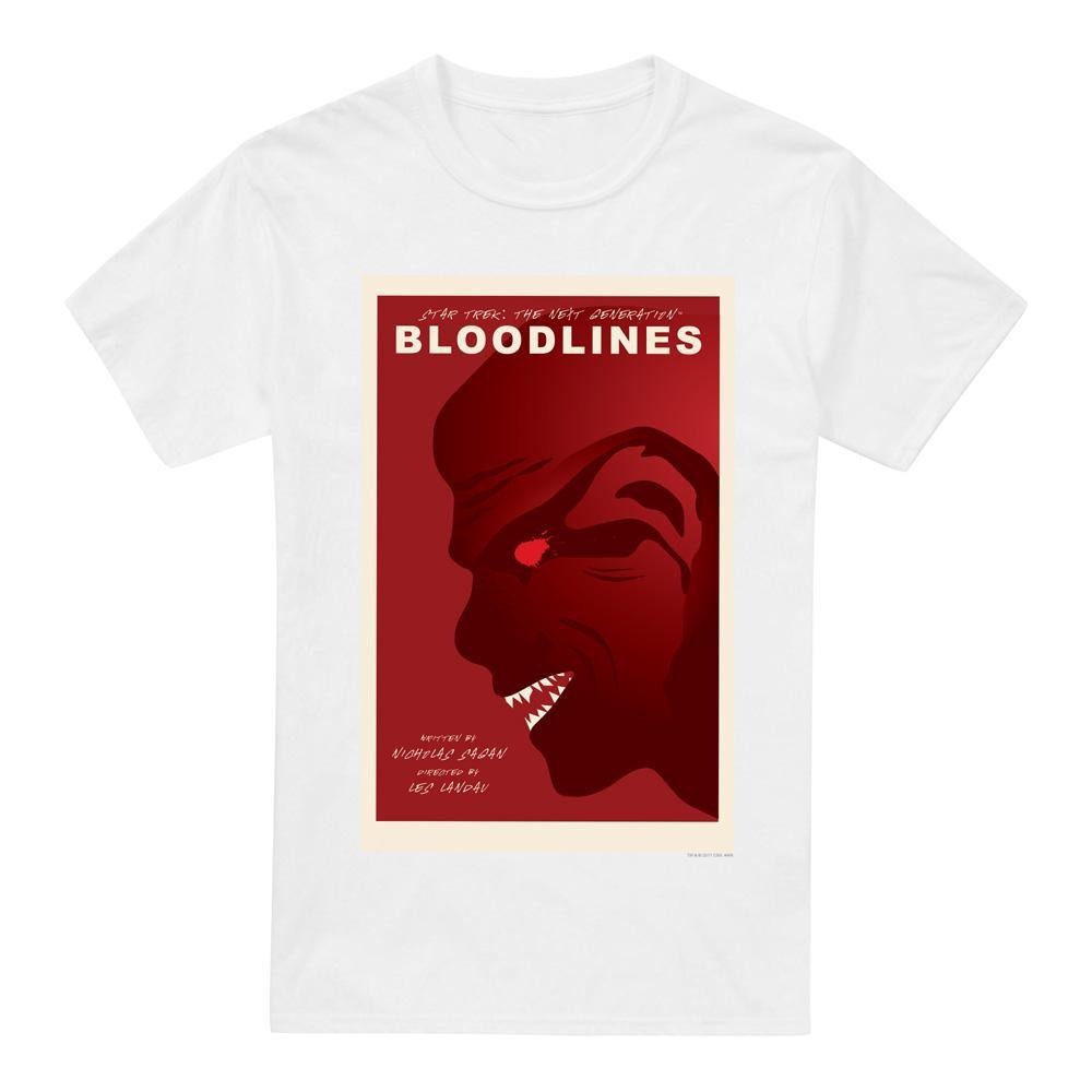 Dieses T-Shirt zeigt eine auffällige Grafik, inspiriert von "Bloodlines", Staffel 7 Episode 22 von Star Trek: The Next Generation. Das Design präsentiert ein bedrohliches rot getöntes Gesicht mit scharfen Zähnen und einem leuchtenden Auge, vor einem kräftigen roten Hintergrund mit cremefarbenen Akzenten. Der Episodentitel und die Autorenangaben sind prominent dargestellt, was dieses Stück zu einem unverwechselbaren Artikel für Fans macht.