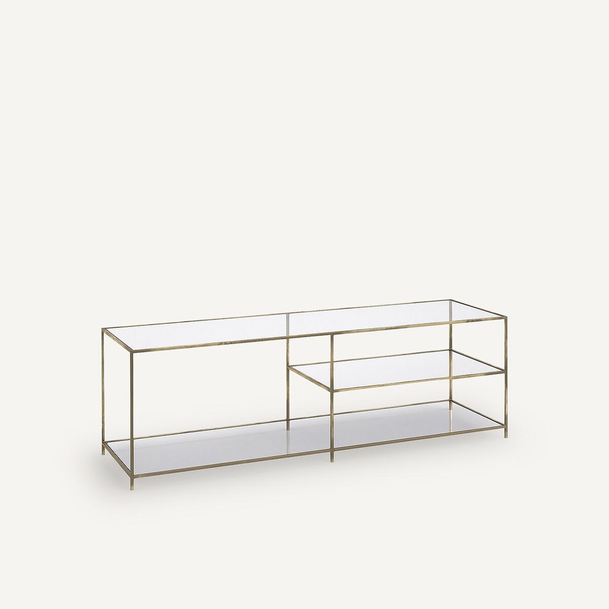 Die Kombi aus elegantem altmessingfarbenen Metall und transparenten Glasplatten verleiht dem TV-Möbel eine besonders leichte und stilvolle Optik.
