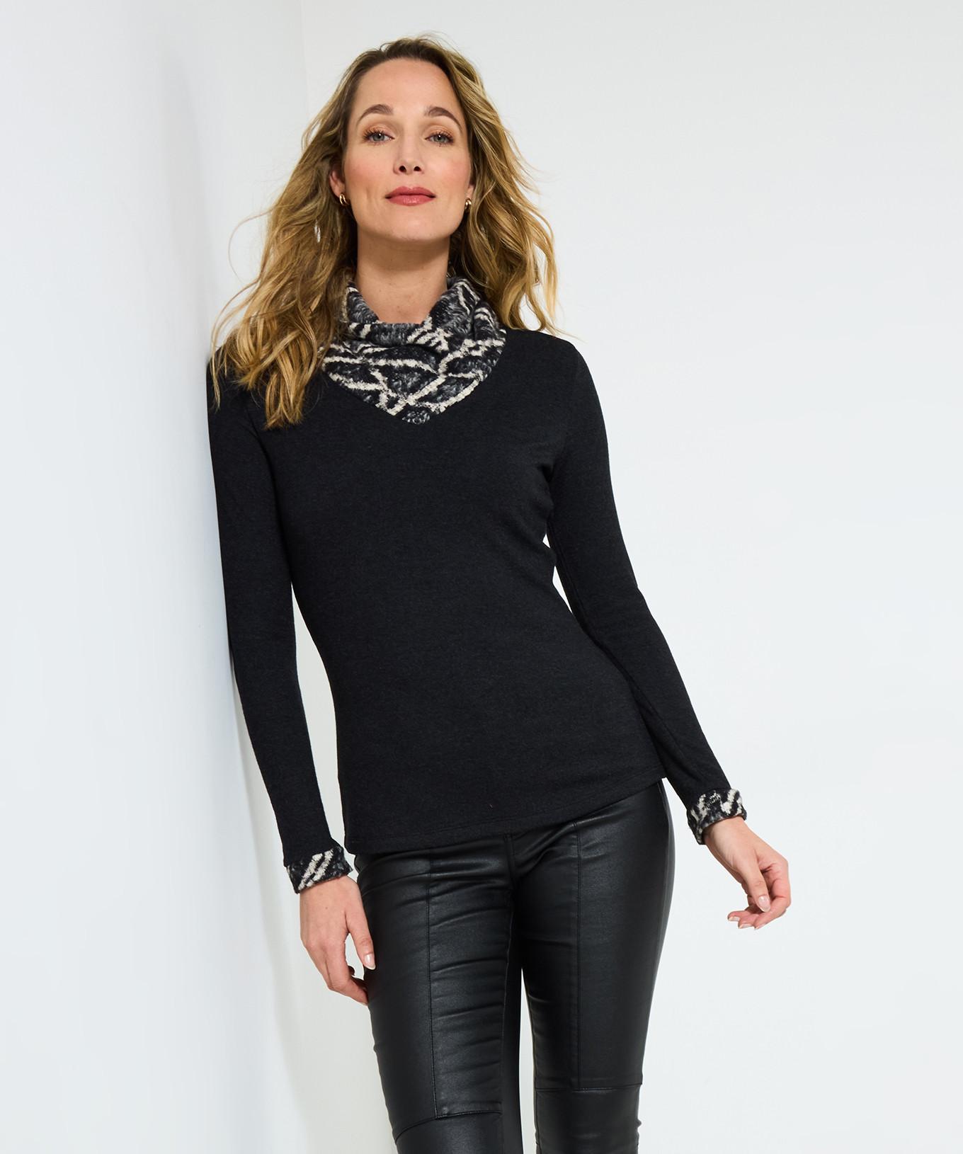 Dieses weiche Jersey-Top verfügt über einen stilvollen Wasserfallkragen, der einen bequemen und modischen Look bietet. Die langen Ärmel sind mit gemusterten Bündchen versehen, die das Design des Ausschnitts ergänzen und dem Kleidungsstück einen Hauch von Eleganz verleihen.