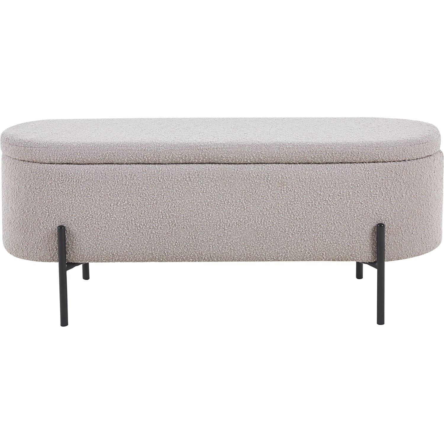 Wer skandinavisches Design mit praktischem Nutzen sucht, für den ist diese Bettbank mit angesagtem Bouclé Bezug die richtige Wahl. Der Polsterhocker punktet nicht nur mit topaktuellem Design, sondern bietet hinter dem klappbaren Deckel auch eine clevere Stauraumfunktion. Ob Decken, Bettbezug oder Kleidung In der Bettbank können Sie auf stilvolle Weise Ordnung schaffen und Herumliegendes verstauen. Der Bouclé Stoff, der schon lange Einzug in unsere Wohn- und Schlafzimmer gehalten hat, vermittelt Wärme und Geborgenheit. Ausserdem spiegelt der Stoff mit seiner wolligen Optik die Essenz des beliebten Scandi Styles gekonnt wider. Das Design-Gestell mit hohen Füssen besteht aus pulverbeschichtetem schwarzem Metall und rundet den Look ab.bezogen mit Bouclé Stofffrei im Raum stellbarSitzhöhe: 44 cmmit aufklappbarem Element und Stauraum in InnerenBezug: 100% Polyestermax. Belastbarkeit: 150 KGBeine schwarz Metall (Stahl) pulverbeschichtetschwarzes Design-Gestell aus pulverbeschichtetem Metall