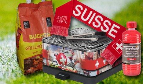 Schweizer EM Grill inklusive Zange, Tasche, Brennpaste, Holzkohle und Fanschal