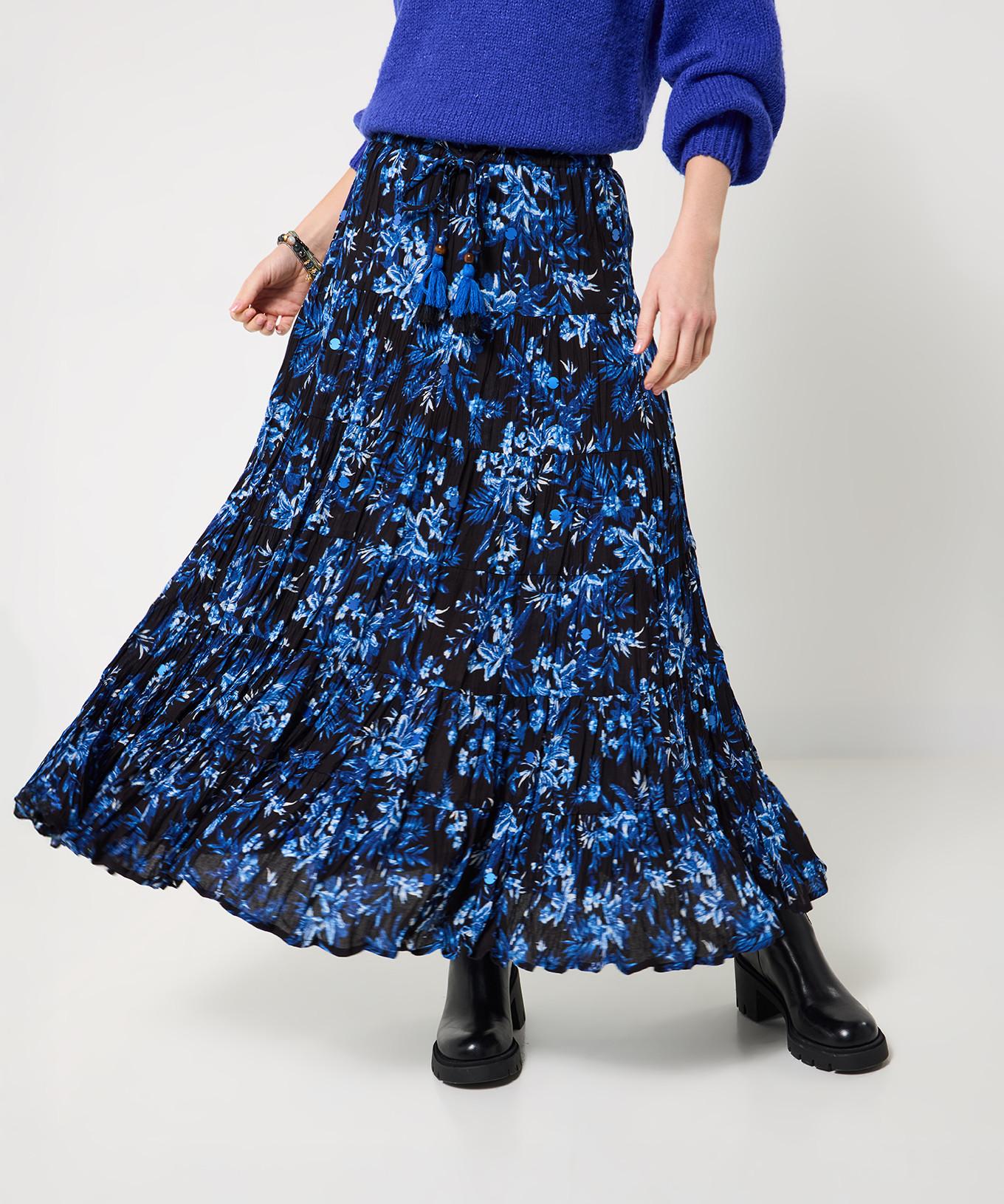 Dieser Maxirock präsentiert sich mit einem lebhaften Blumenmuster und einer stilvollen Knopfleiste. Das Design umfasst einen Kordelzug in der Taille mit dekorativen Quasten, der sowohl Komfort als auch einen Hauch von Bohème-Flair bietet. Seine fliessende Silhouette macht ihn zu einer vielseitigen Ergänzung für jede Garderobe.