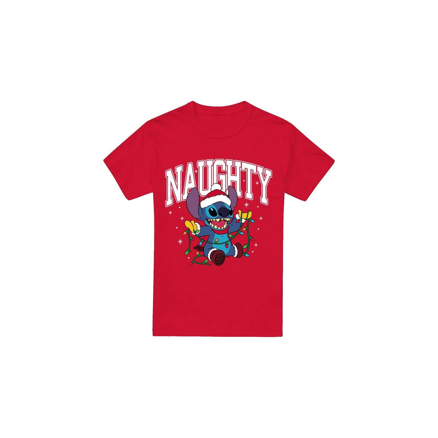Dieses T-Shirt zeigt eine verspielte Grafik von Stitch aus Disneys Lilo & Stitch, geschmückt mit einer Weihnachtsmütze und verheddert in Weihnachtslichtern, begleitet vom Wort „NAUGHTY“. Die leuchtend rote Farbe und das festliche Design machen es zu einer fröhlichen Ergänzung für jede Freizeitgarderobe.